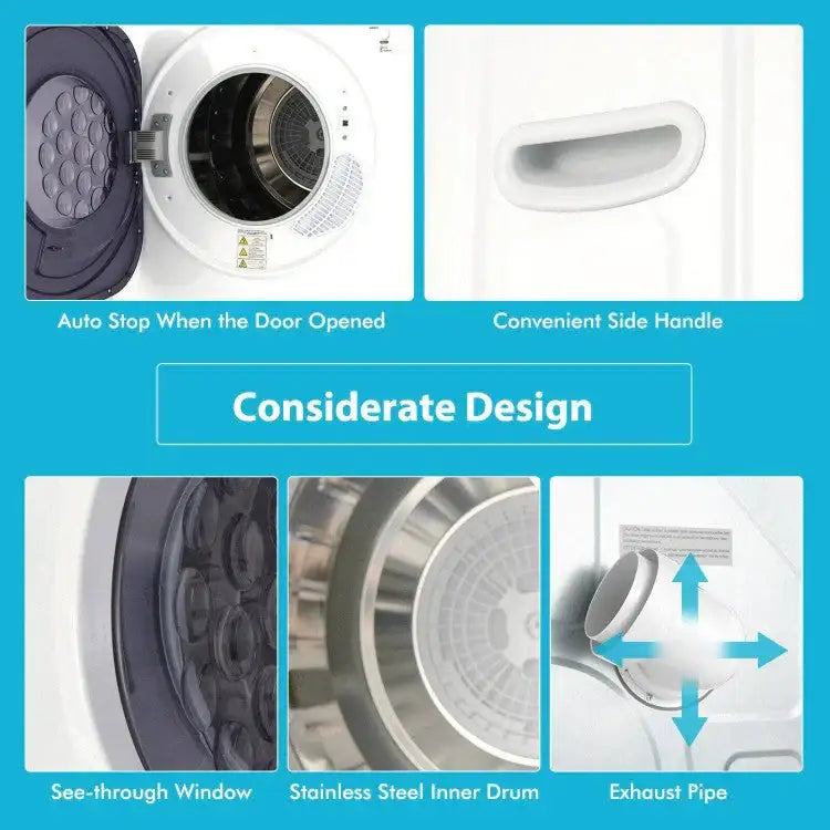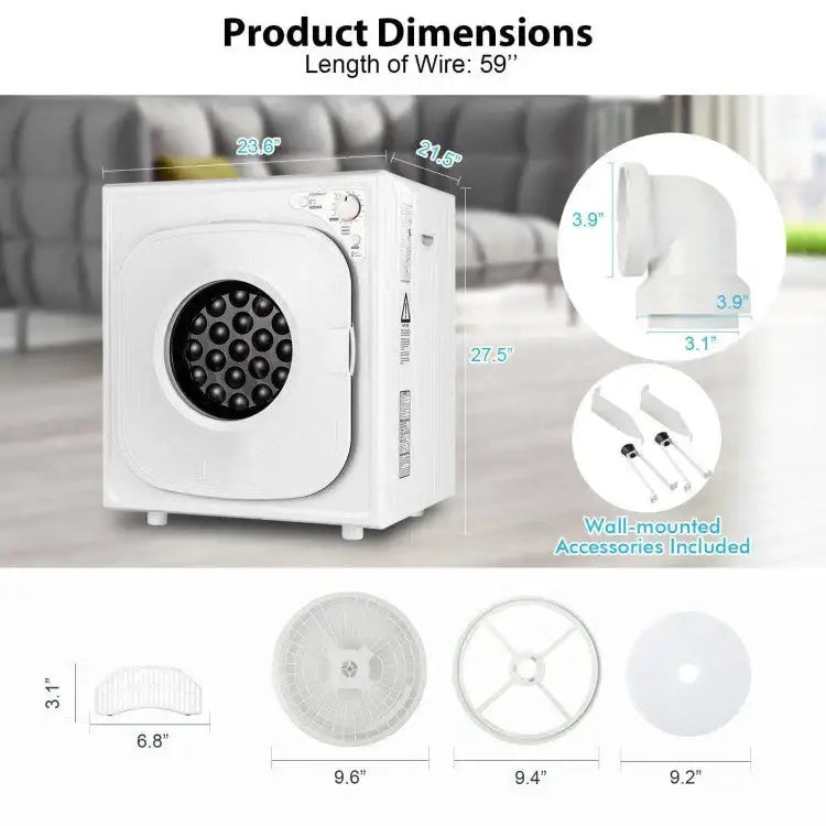 Make laundry day easier with this 1500W Compact Laundry Dryer, designed for small spaces without sacrificing drying performance. Featuring a sleek touch control panel and multiple drying modes, this electric dryer ensures your clothes come out warm, dry, and wrinkle-free. Ideal for apartments, dorms, and RVs, it offers quiet operation, efficient performance, and easy installation whether mounted on the wall, stacked, or placed freestanding.