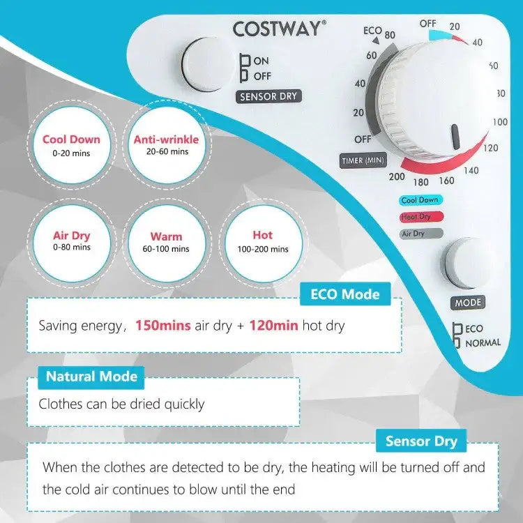 Choose from different programs like Cool, Warm, Hot, Anti-Wrinkle, and Air Dry