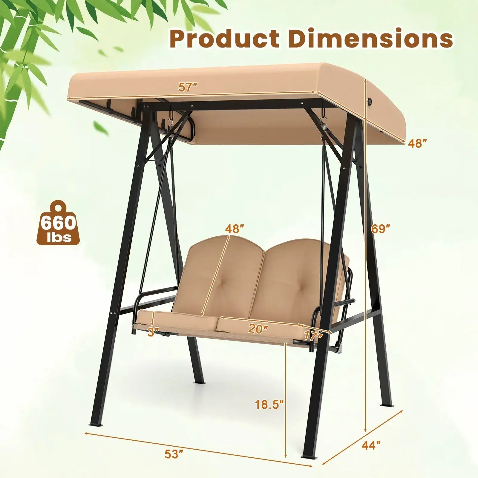 ● Adjustable canopy offers protection against sunlight● Wide sitting area is perfect for 2 people to relax together● Soft and elastic cushions offer much comfort● Tufted design of back cushions for more elegance● Solid A-shaped metal frame for high stability● Mesh seat fabric is breathable and cozy● Non-slip footpads make the porch swing stabler● Strong spring hooks firmly hold the swing chair● Ideal for poolside backyard balcony and so on● Assembly is requiredInstallation guide