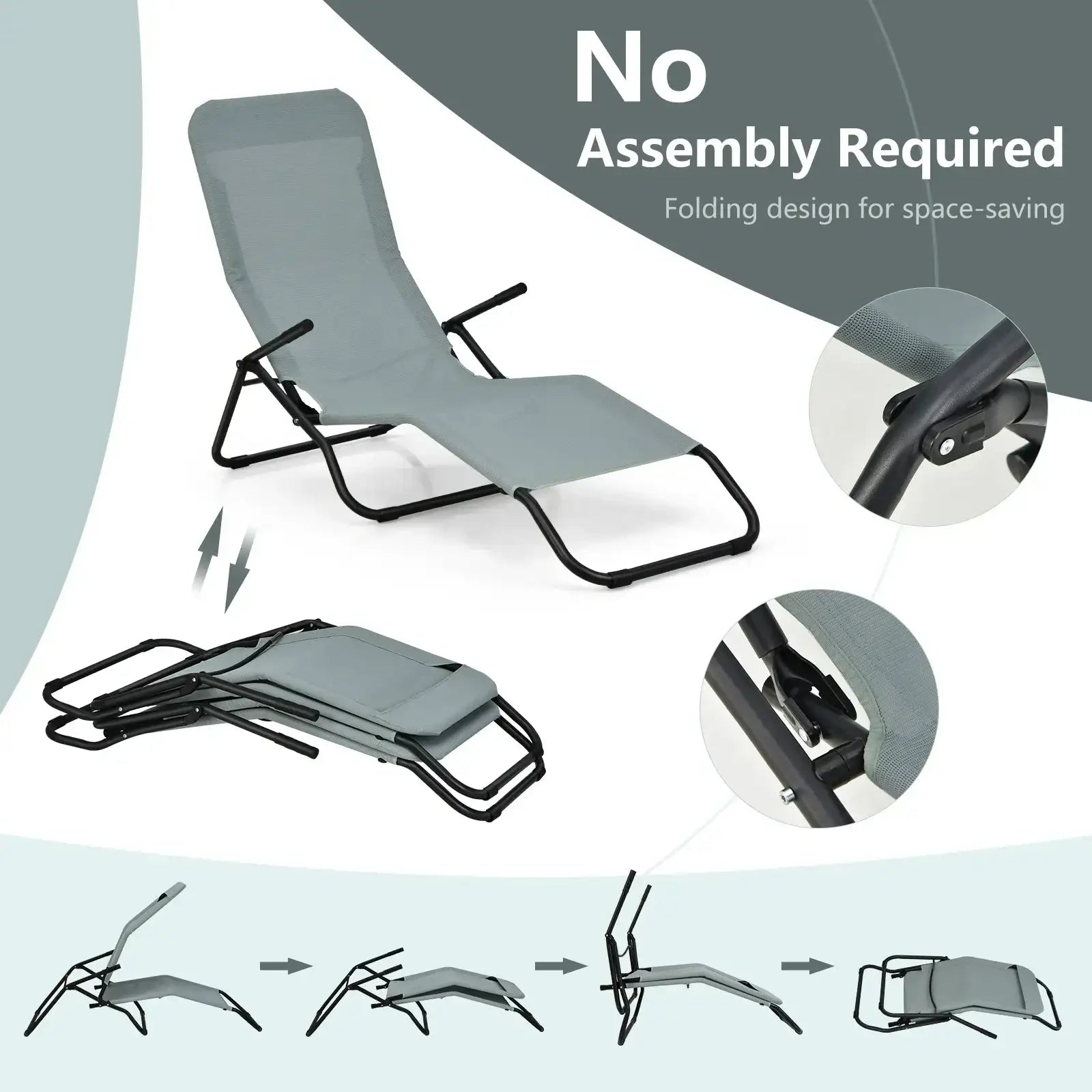 Lie on this 2-piece patio chaise lounges with your beloved one and enjoy a relaxing summer afternoon!   The ergonomically designed seat with high backrest and non-slip armrests provides you with an ultra-comfortable lying experience. And you can swing back and forth for better relaxation. The breathable seat fabric ensures good air circulation and gets rid of your hotness. In addition the chaise lounge is also super sturdy with the heavy-duty and rustproof steel frame. And protective bottom foot caps add to higher stability and prevent scratches to the ground. When finishing relaxation you can quickly fold the chaise lounges and then stack them together for space-saving storage. If you are fond of relaxing outdoors this 2-piece chaise lounges will be a perfect choice for you.   If you are looking for a patio chaise lounge like this do not hesitate to place an order!   Rocking design makes you feel more relaxed Ergonomically curved seat offers more comfort Wearable and breathable fabric for high durability and cool feeling Anti-slip handles for solid and cozy grip Heavy-duty steel structure for high-level stability and safety Powder-coated surface makes the steel pipes resist to rust Protective foot caps avoid scratches to the ground Folding and stacking design makes it easy to store and carry Ideal for poolside backyard garden etc. No need to assemble just unfold it and then use it