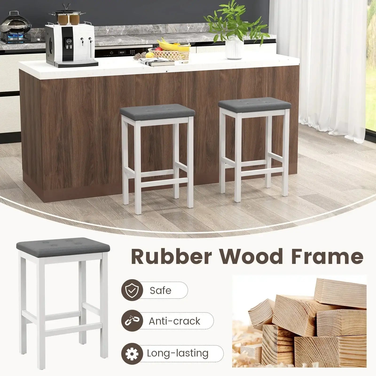 ● Rubber wood frame is safe anti-crack and long-lasting● Features a comfy padded seat to reduce discomfort● Skin-friendly PVC leather is also durable and low-maintenance● Filled with high-density sponge which feels super comfortable● With a footrest design which is considerate to relax your legs● Thanks to tufted buttons each stool can offer an elegant design● Comes with triangle connections to safeguard ideal stability● Anti-slip foot pads will ensure no more scratches on the floor