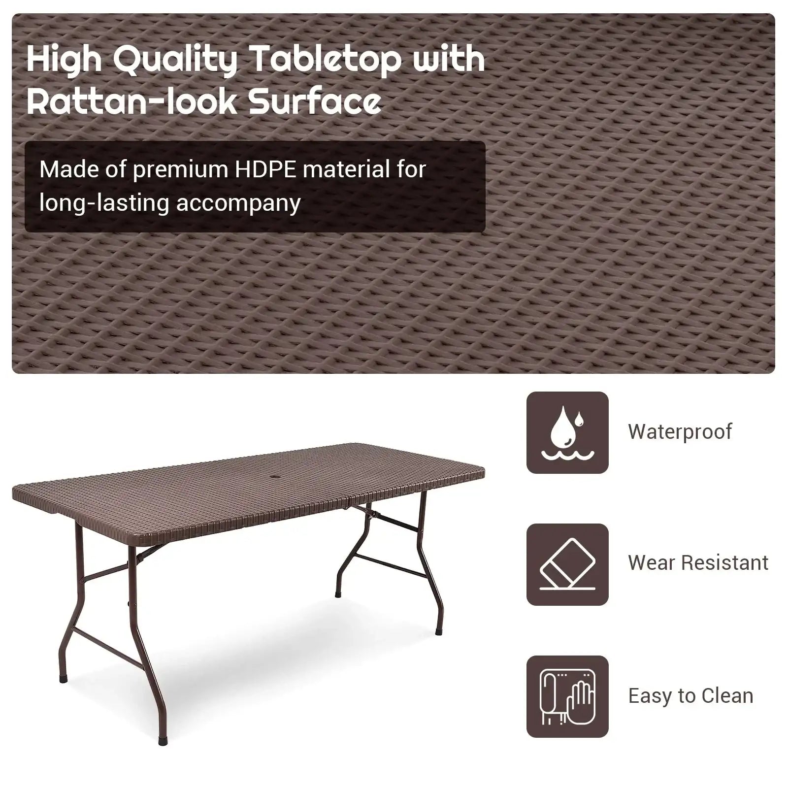 ● Brand new and high quality● Excellent HDPE and sturdy steel durable to use● Smooth avoid scratching and wipe-clean● Water-proof not easy to fade color● Convenient folds in half with a handle easy to storage carry space-saving● With an interlocking midsection to strengthen the central area and legs ● Pastoral rattan weave design ● Passed the test of EN581● Safe and environmental friendly