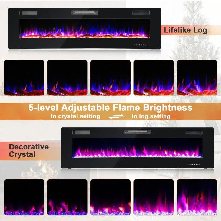 Bring modern elegance and cozy warmth to your space with this 68-Inch Ultra-Thin Electric Fireplace. Designed for both recessed and wall-mounted installation, it features a sleek, slim profile that complements contemporary interiors. The combination of crystal and log bed decoration delivers a luxurious flame effect with adjustable brightness and multiple color options. Perfect for living rooms, bedrooms, or offices, this fireplace offers customizable heat settings and a stunning visual centerpiece—all with the convenience of remote and touch control.