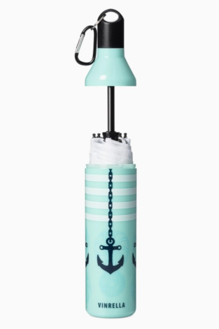An umbrella for those who think life is better on a boat. The perfect gift for the person who wakes up hoping it’s a good day to sail. Umbrella details: Manual open Black powder coated steel frame Fabric: 100% polyester 36” diameter Bottle details: ABS plastic Carabiner clip attached Height: 10.25” Diameter: 36” Width: 2.25"