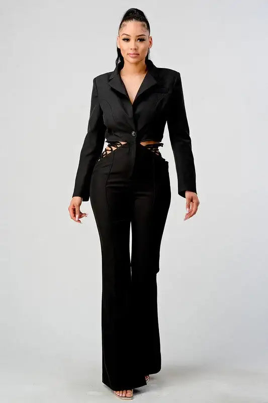 This two-piece business casual set includes an understated black top featuring cut-out waist detail, long sleeves, and a front button closure. The set features an imported construction for reliable quality. Look sharp and sophisticated in this timeless set.