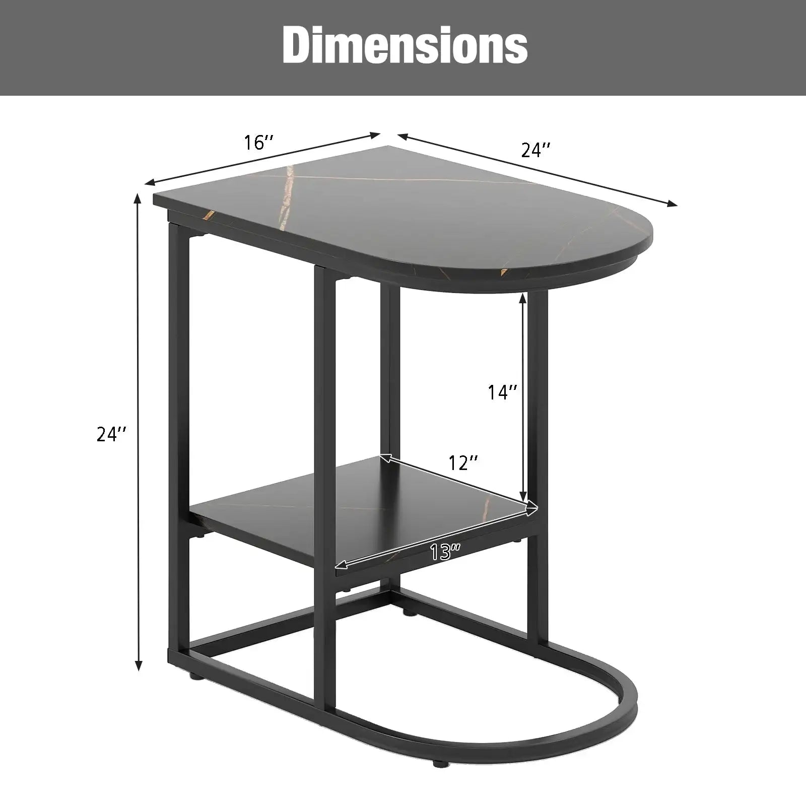 ● Sturdy C-shaped metal frame can fit tight spaces● Rounded corners ensure safe use● 2-tier storage space for table lamps alarm clocks and cups● Luxurious faux marble tabletop will add a touch of modern elegance● Heavy-duty metal frame for long-lasting support● 1"/2.5 cm low-profile stable base can easily slide under furniture● Adjustable foot pads make the table adapt to uneven floors● Easy-to-clean surface saves you time and effort● Suitable for living rooms bedrooms and lounges● Assembly needed