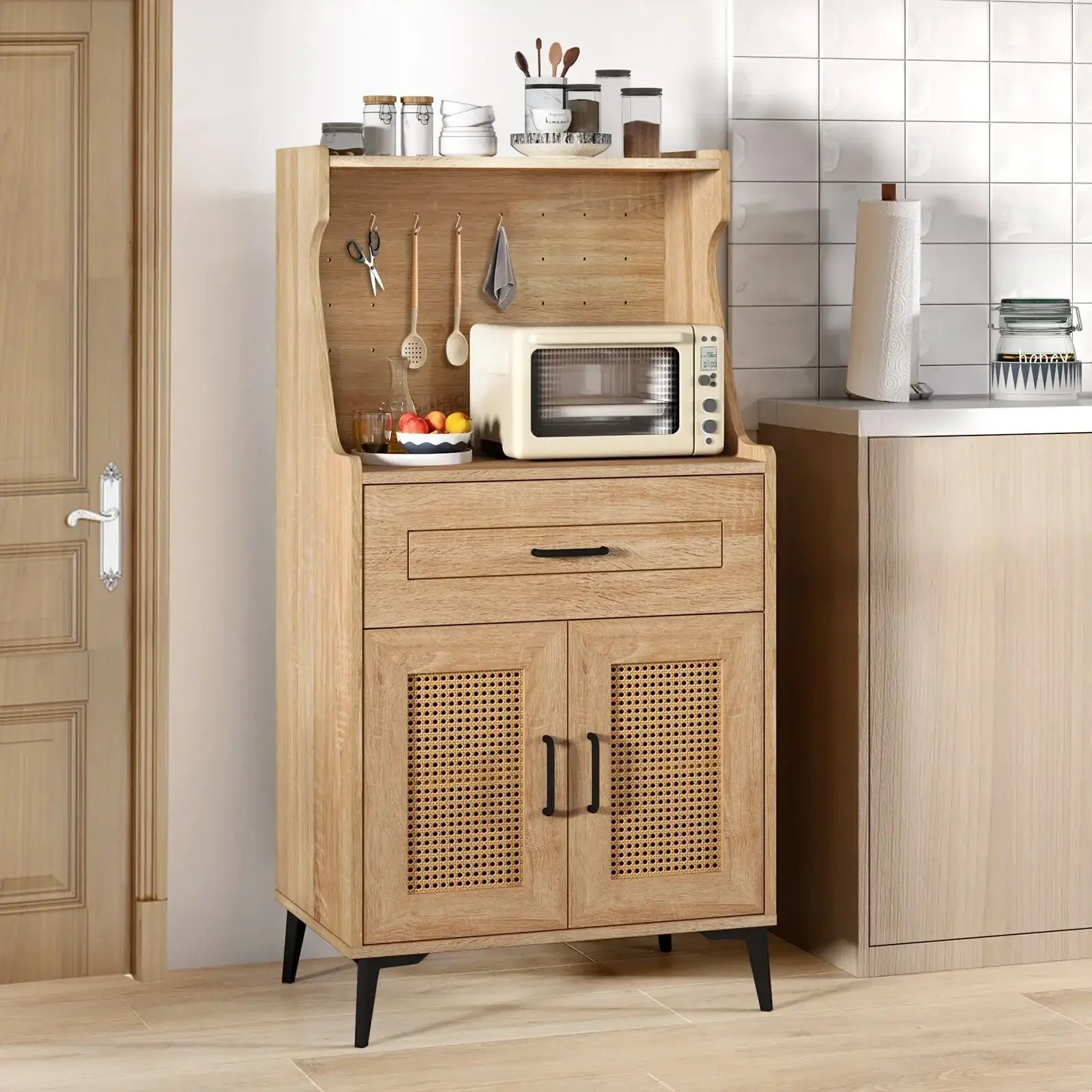 ● Ample storage space for kitchen appliances tableware and seasoning● Includes 2 adjustable shelves each can be adjusted to 3 positions● Handy pegboard for hanging various items (hooks are not included)● 4 metal support legs ensure a high load and long service life● Sleek round corners protect users from accidental injuries● Premium metal hinges make it easy to open the cabinet doors● 5"/12 cm clearance for easy floor cleaning● Rattan doors with hand-woven texture show an organic beauty● With 2 anti-tipping kits to prevent falling accidents