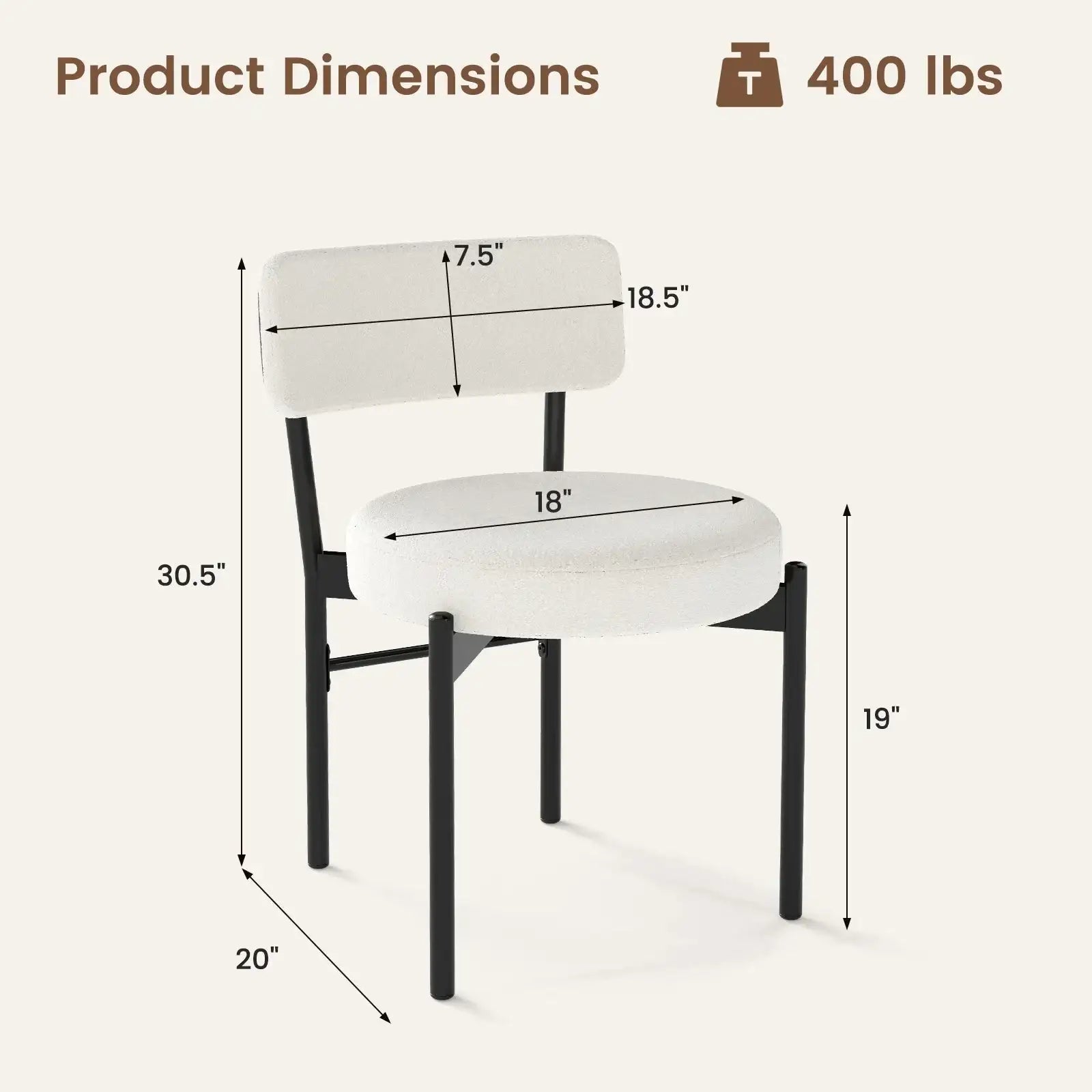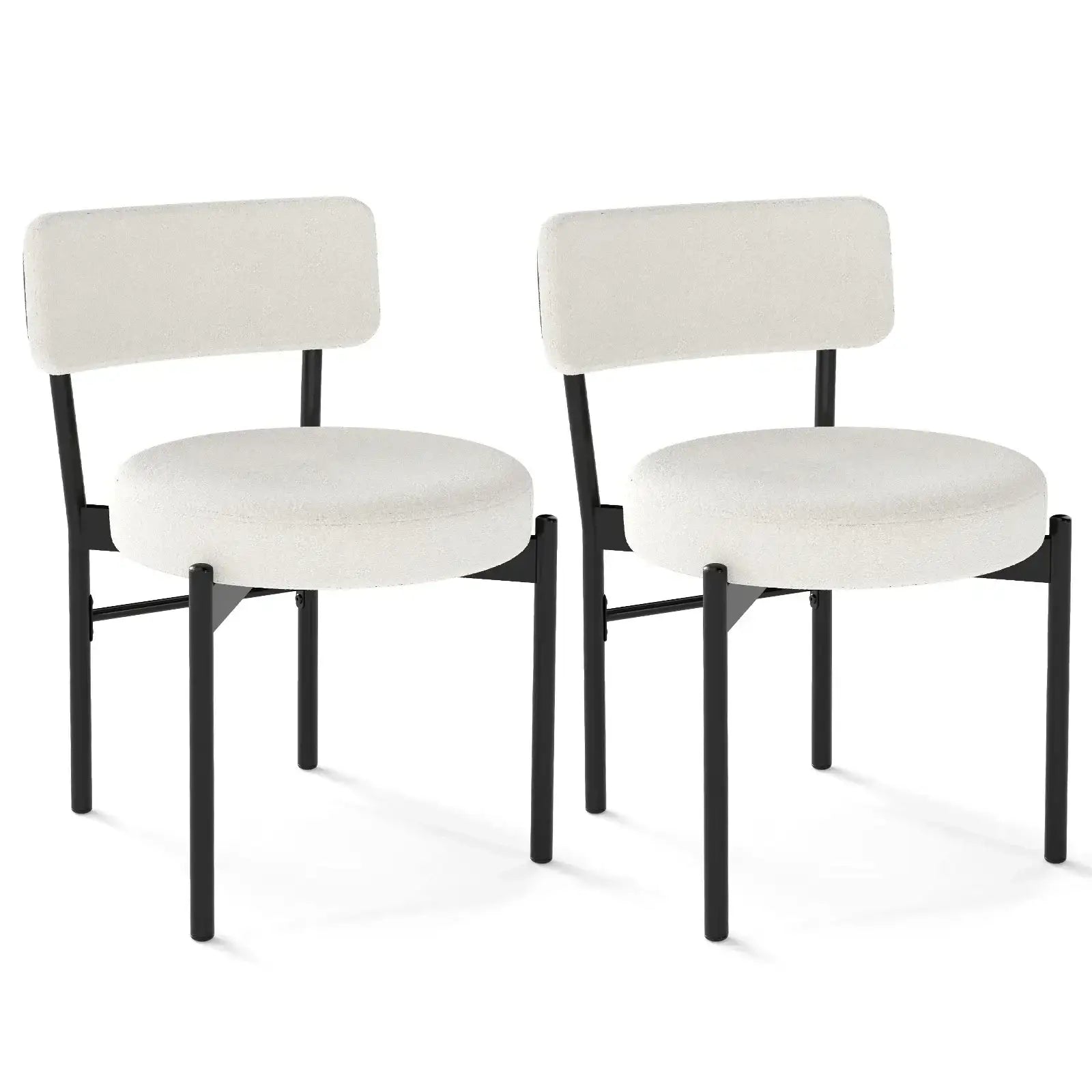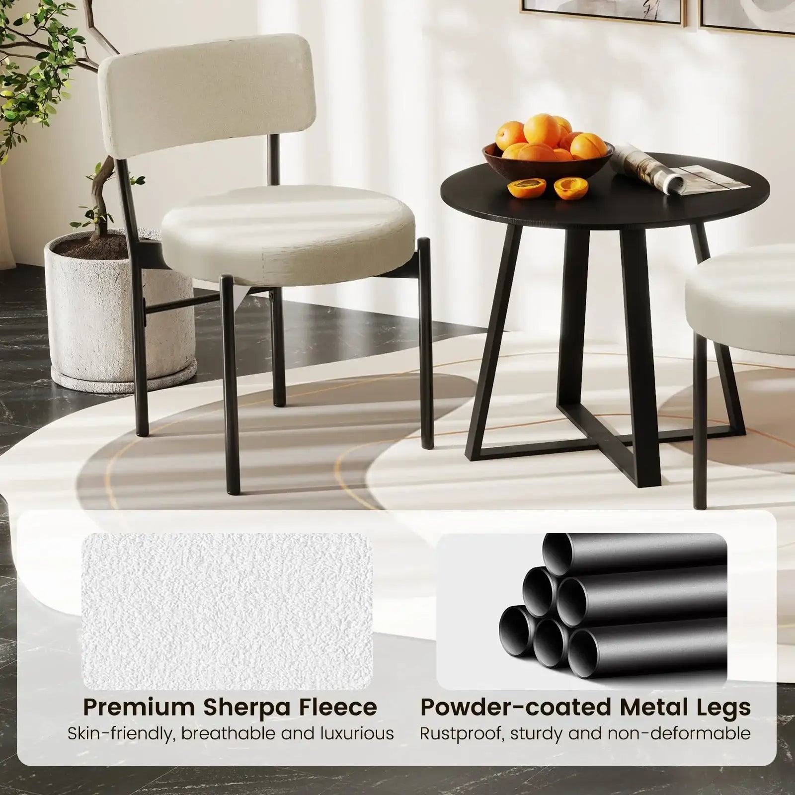 ● Premium sherpa fleece covering is skin-friendly breathable and luxurious● 3.5"/9 cm thick padded seat ensures a relaxing sitting posture● Ergonomic curved backrest will cradle and support your waist comfortably ● Powder-coated metal legs are rustproof sturdy and non-deformable● Reinforced crossbar and strong X-shaped structure ensures excellent sturdiness● Featuring adjustable foot pads to protect your floor and enhance stability● Contemporary design fits various occasions such as dining room cafe or restaurant● Assembly needed