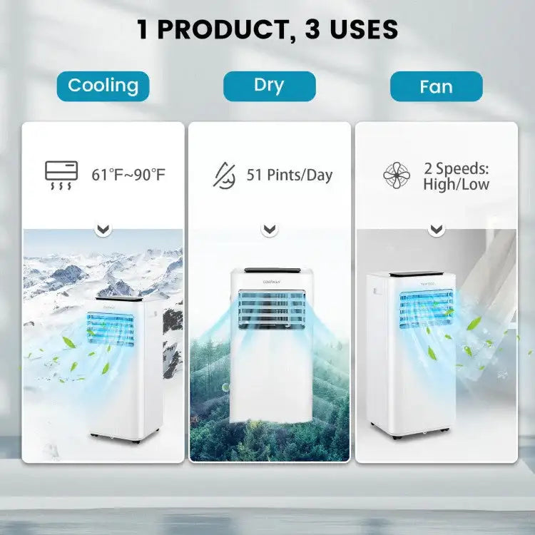 Enjoy cool, refreshing air wherever you need it with this 8000/10000 BTU (ASHRAE) portable air conditioner. Designed for spaces up to 300–350 sq. ft., this unit delivers powerful cooling, dehumidifying, and fan functions all in one compact and mobile design. The included remote control and user-friendly interface make operation simple and convenient, whether you're at home, in the office, or in a dorm.