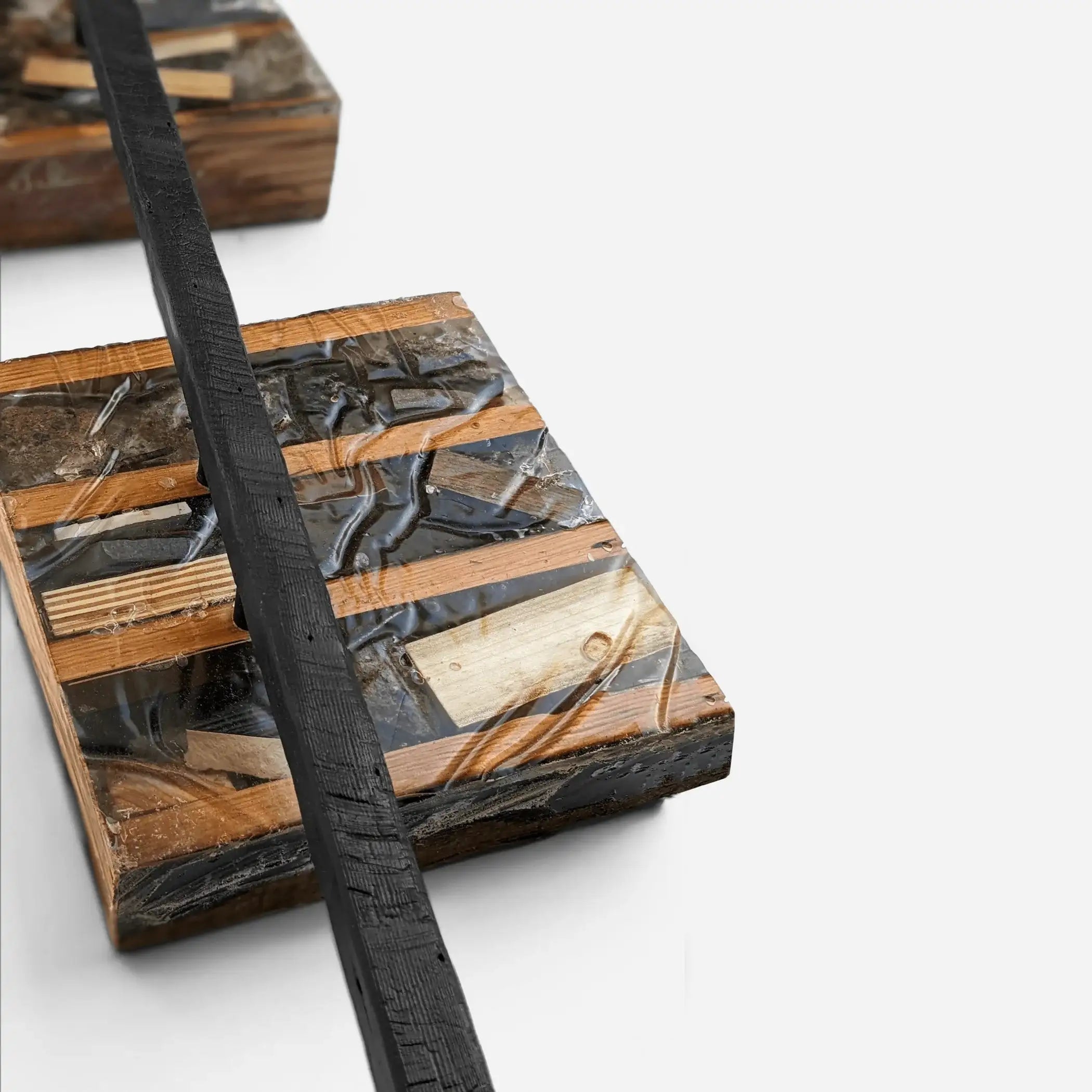 The creation process is a testament to dedication and care. Our skilled artisans connect with local job sites to carefully select the materials, ensuring each piece tells a story of its previous life. Upon collection, the materials are meticulously cleaned and processed before being laid out artfully between twelve wood sections. Eco-resin is then poured over the arrangement, capturing the essence of the materials underneath. After the resin cures, each piece is sanded and polished to perfection, resulting in a smooth, high-quality finish that enhances any space.