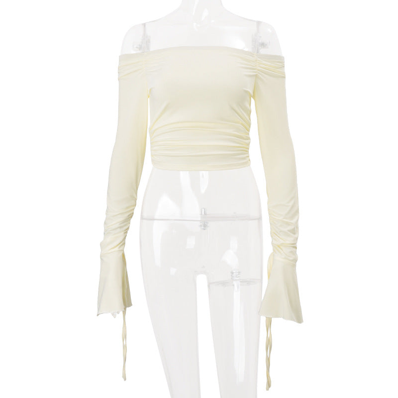 Fall Women Clothing Sexy off Shoulder Bell Sleeve Solid Color Slim Fit T shirt Top
