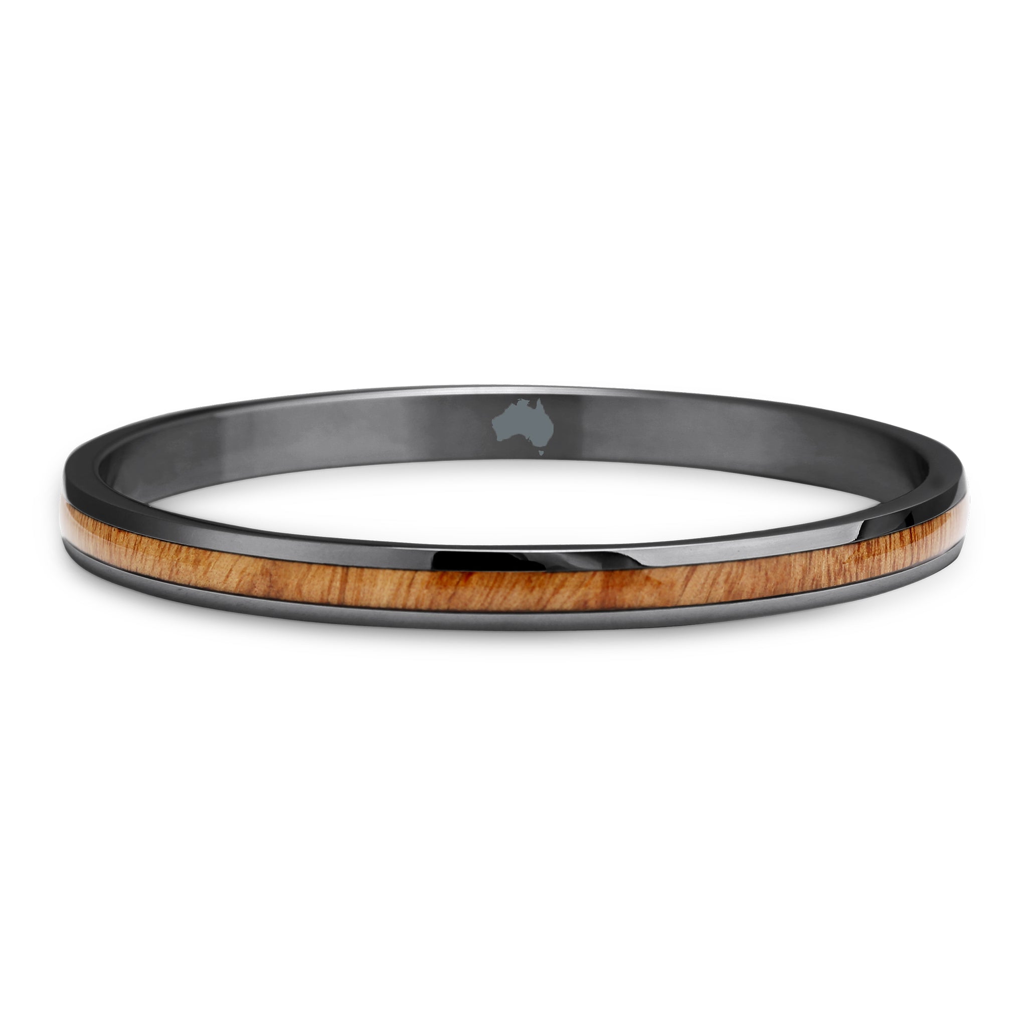 Our Gum Burl (Tasmanian Oak/Stringybark) timber bangle bracelet consists of a surgical grade gunmetal plated stainless steel bangle inlaid with genuine Gum Burl (Tasmanian Oak/Stringybark) timber. Each bangle has Australia engraved inside. Designed for daily wear in any lifestyle, our timber bangles are waterproof, durable and backed by a lifetime wood inlay warranty. Whether an elegant night out in the city or strolling the beach with toes in the sand, the Gum Burl (Tasmanian Oak/Stringybark) timber inlaid bangle bracelet is the perfect accent for any occasion.