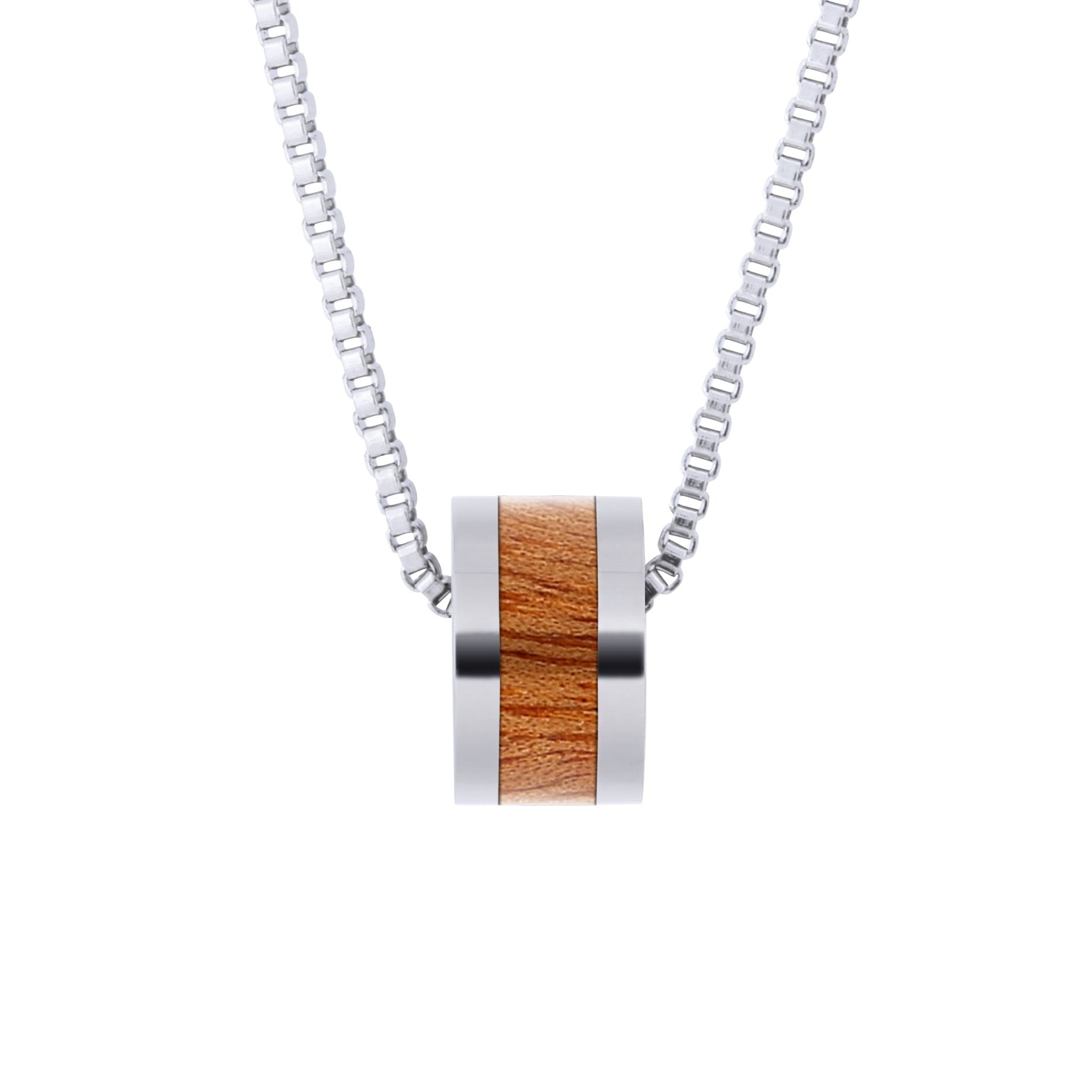 Stainless steel barrel bead pendant inlaid with responsibly sourced Gum Burl (Tasmanian Oak/Stringybark) timber. Barrel bead also fits most popular charm bracelets. Chain... Read more