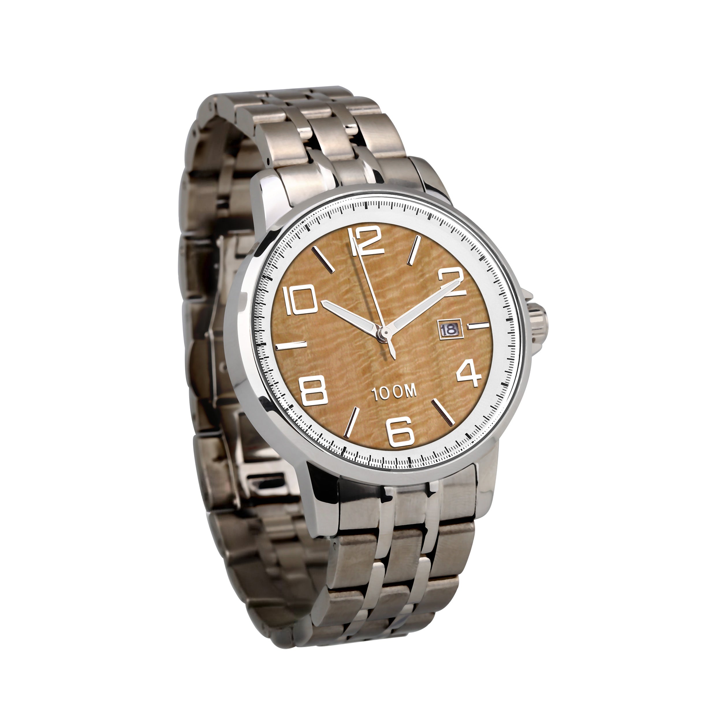 Men's Stainless Steel watch with Australian Gum Burl timber(Eucalyptus obliqua). Metal numbers with glowing hands and date. One year warranty on materials and craftsmanship.