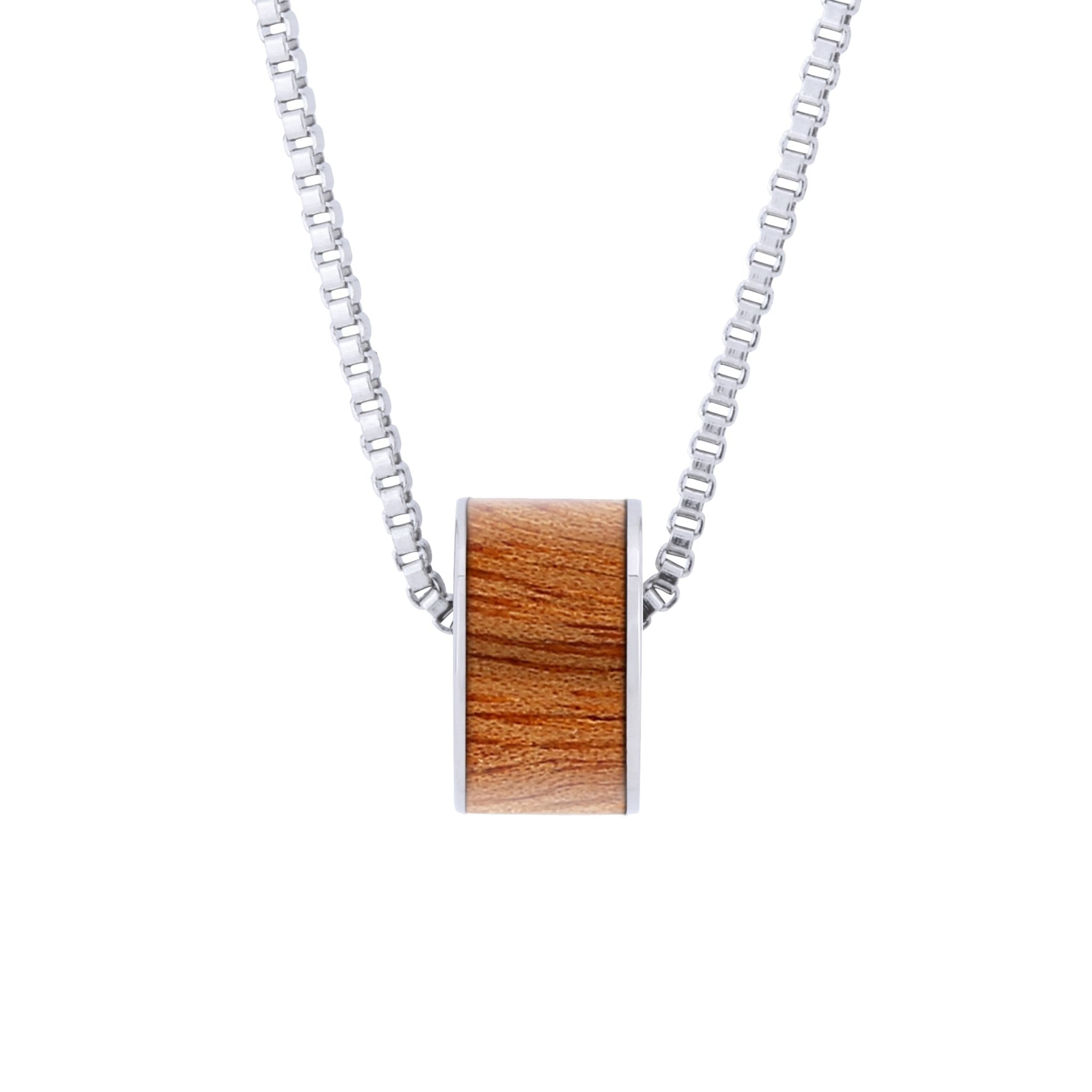 Stainless steel barrel bead pendant inlaid with responsibly sourced Gum Burl (Tasmanian Oak/Stringybark) timber. Barrel bead also fits most popular charm bracelets. Chain... Read more