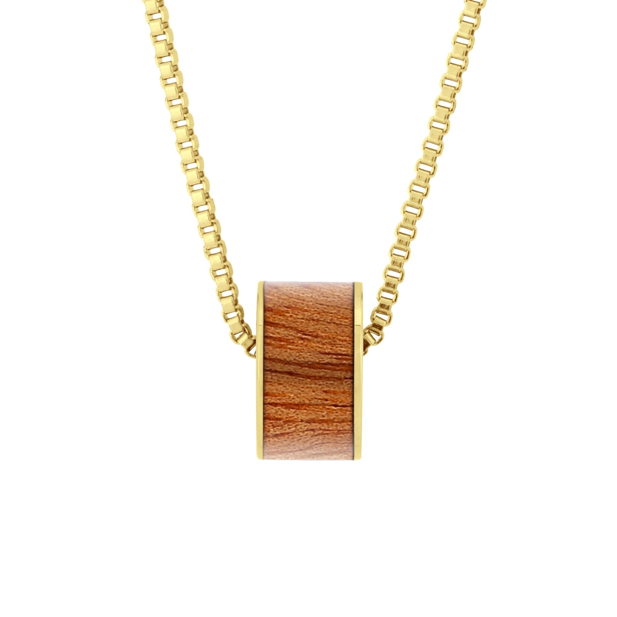 Yellow Gold plated stainless steel barrel bead pendant inlaid with responsibly sourced Gum Burl (Tasmanian Oak/Stringybark) timber. Barrel bead also fits most popular charm bracelets.