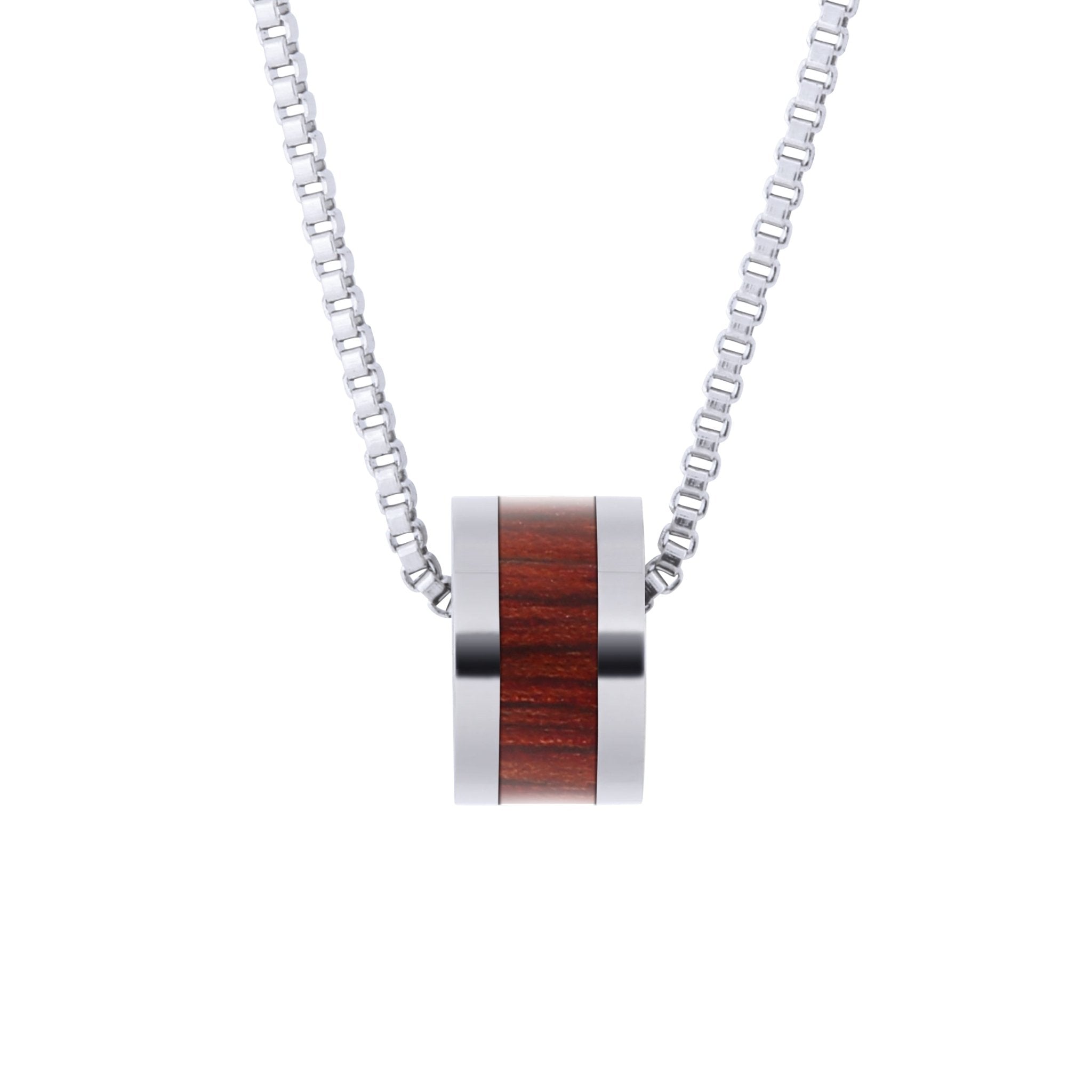 Stainless steel barrel bead pendant inlaid with responsibly sourced Jarrah timber from southwest Australia. Chain necklace not included.  Metal: Stainless Steel Wood Inlay: Jarrah Engraving: None... Read more