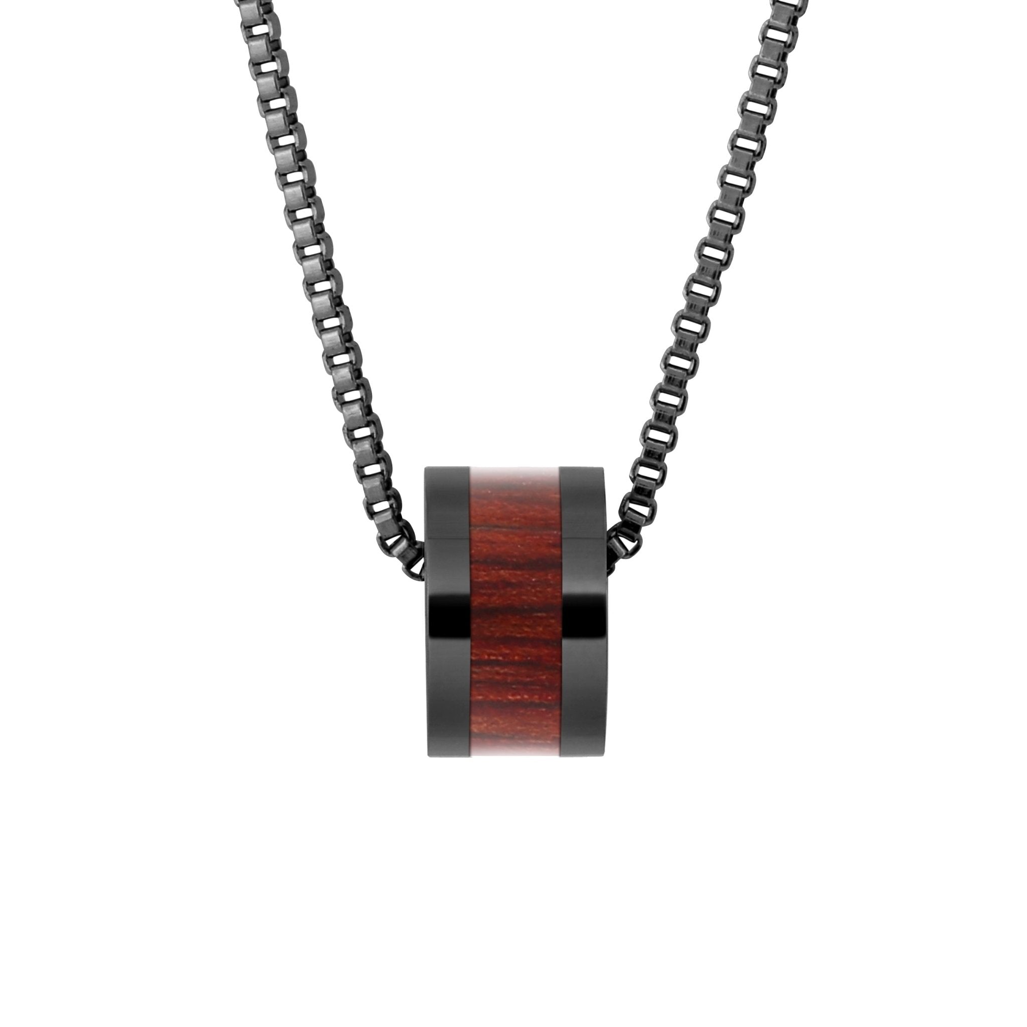 Gunmetal plated stainless steel barrel bead pendant inlaid with responsibly sourced Jarrah timber from southwest Australia.
