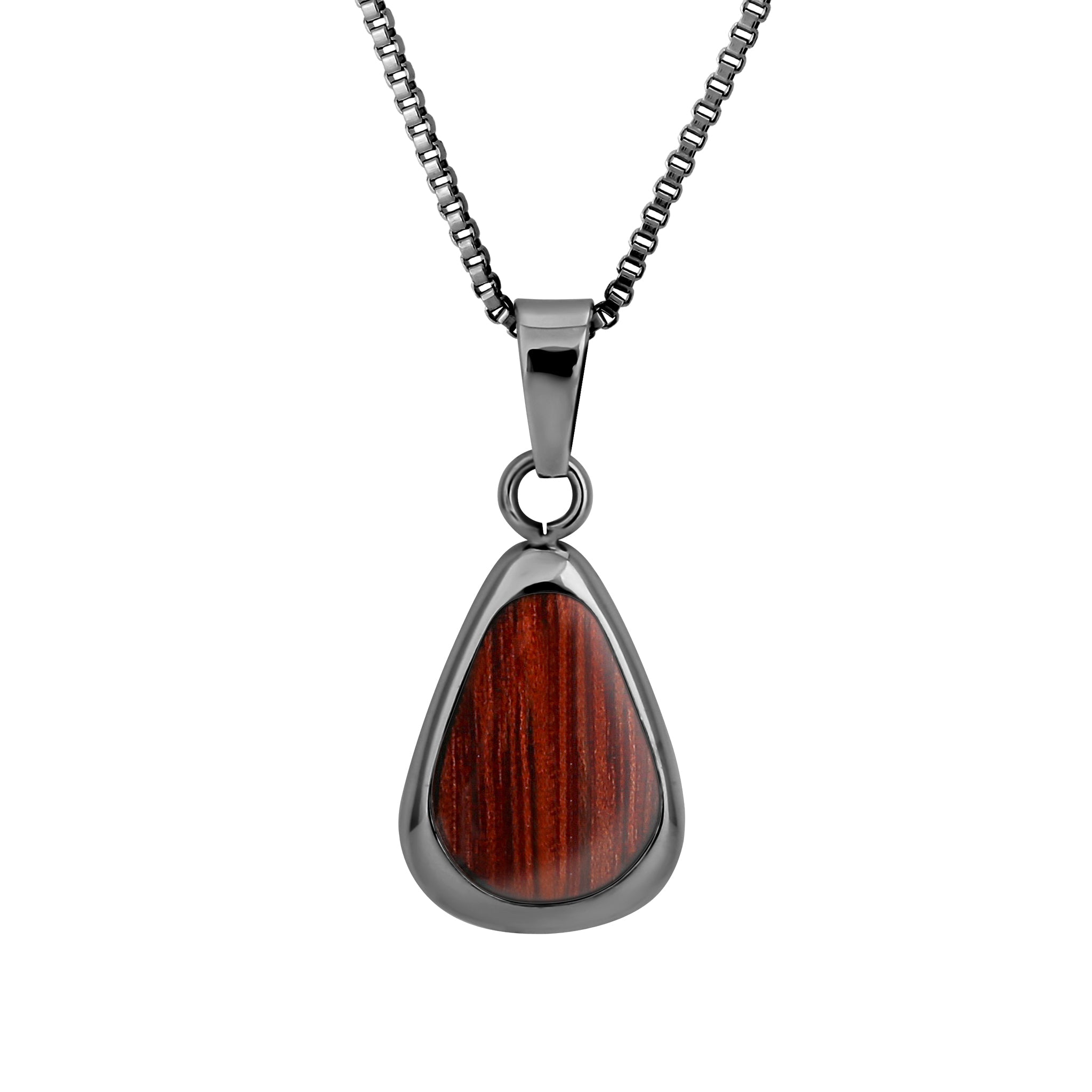 Beautifully crafted Gunmetal plated water drop necklace inlaid with responsibly sourced Jarrah from southwest Australia.