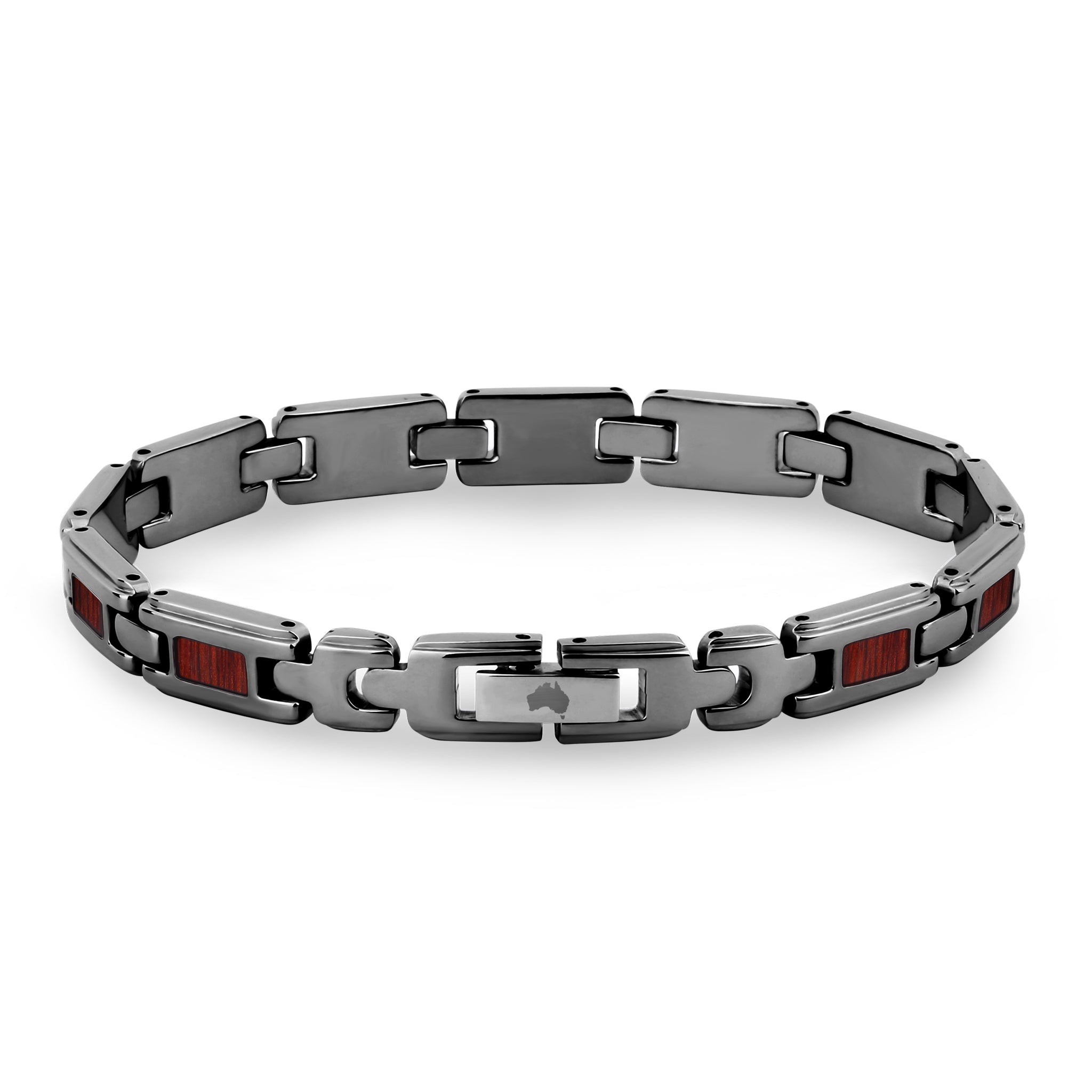 Ladies Gunmetal plated stainless steel link bracelet with Australian Jarrah wood inlays. Links are removable to adjust for size.