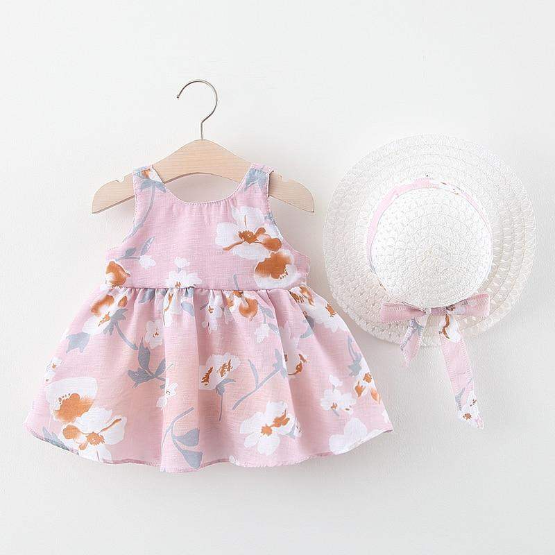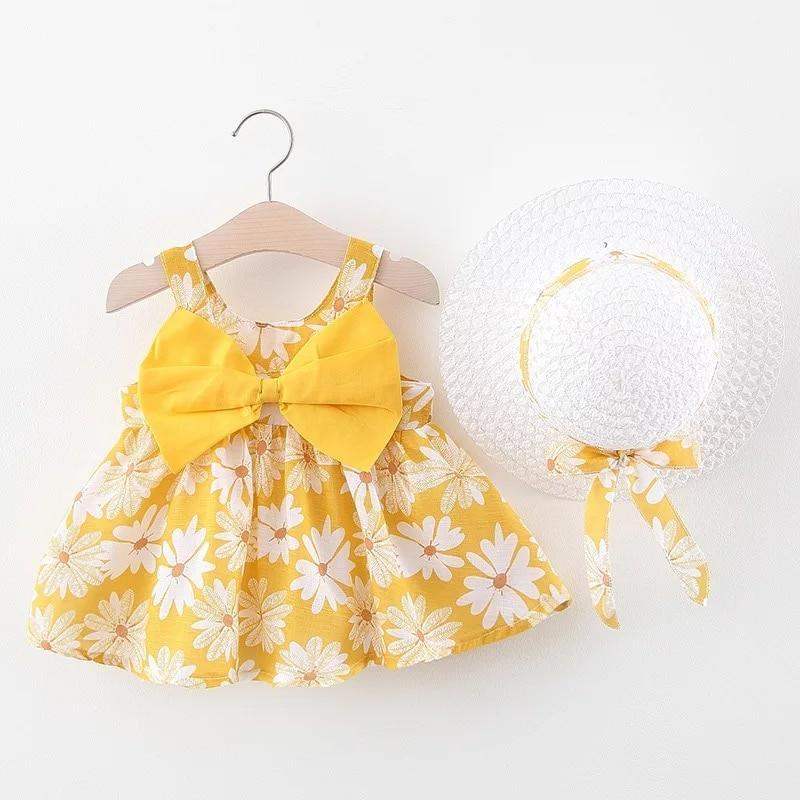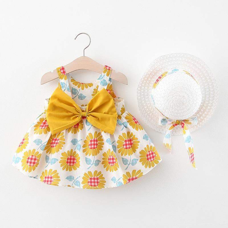 Luxury Modern Elegant Summer Bow Print Dress With Hat 2 piece Baby Clothes Suits Newborn Toddler Dress