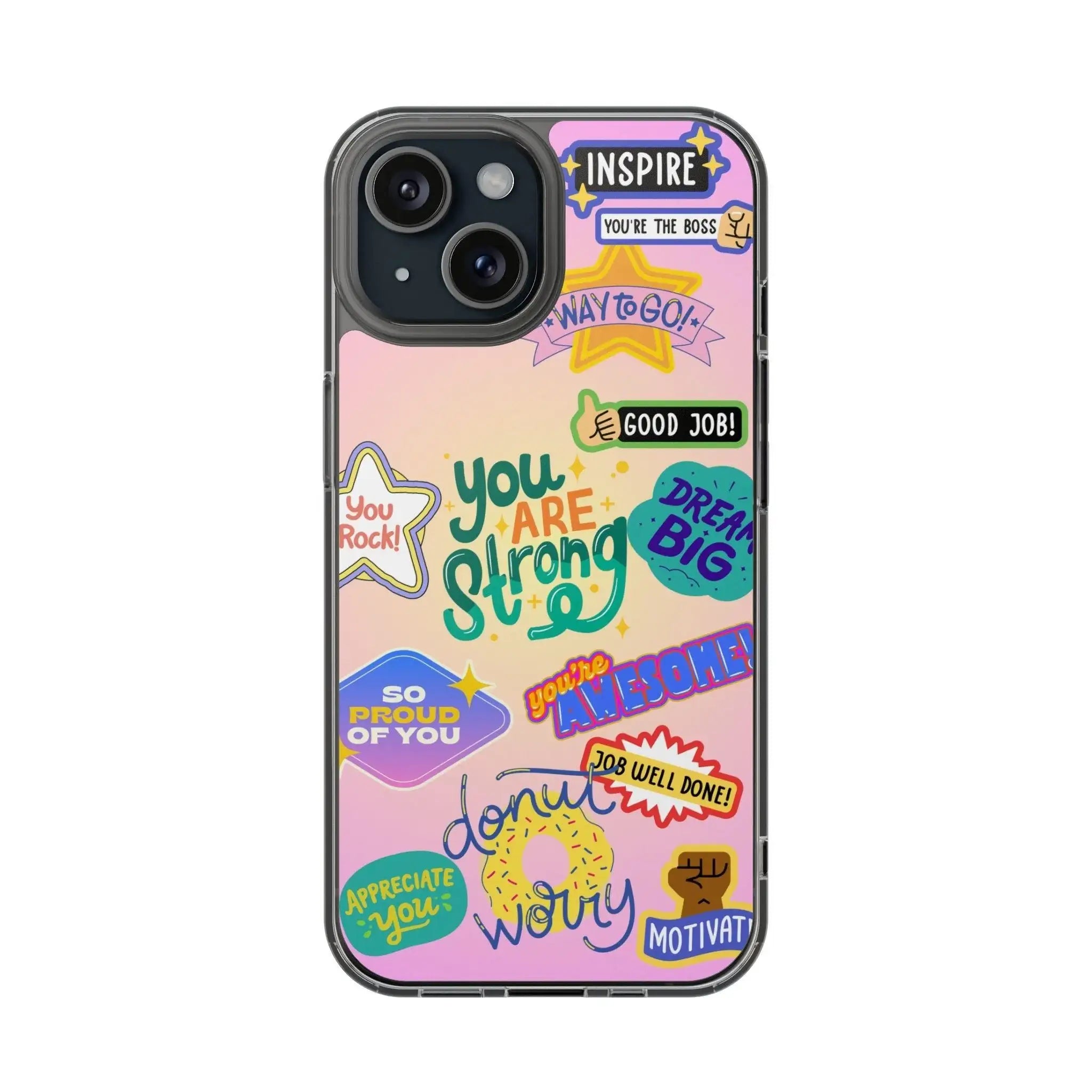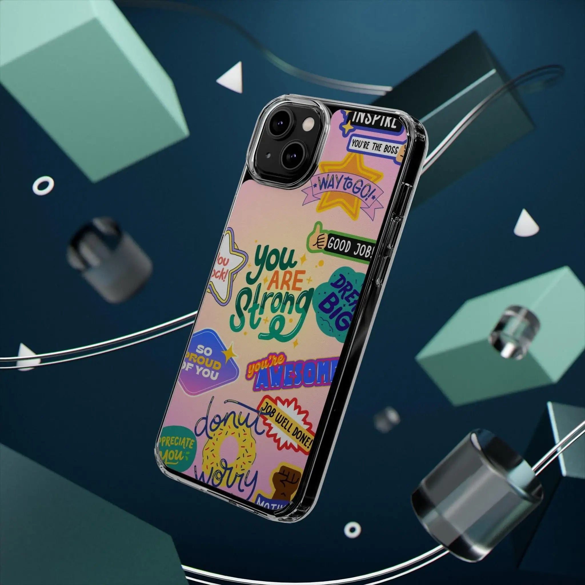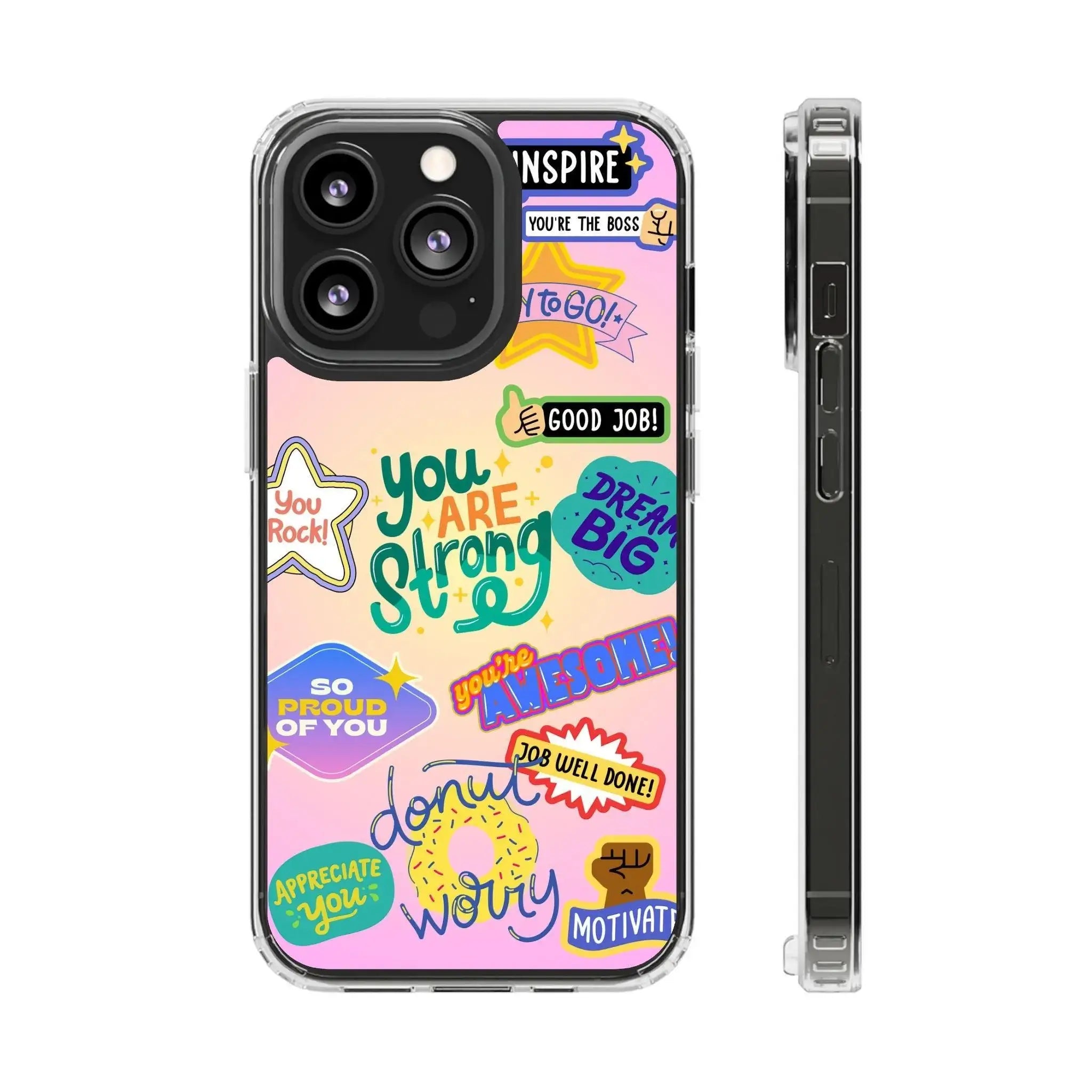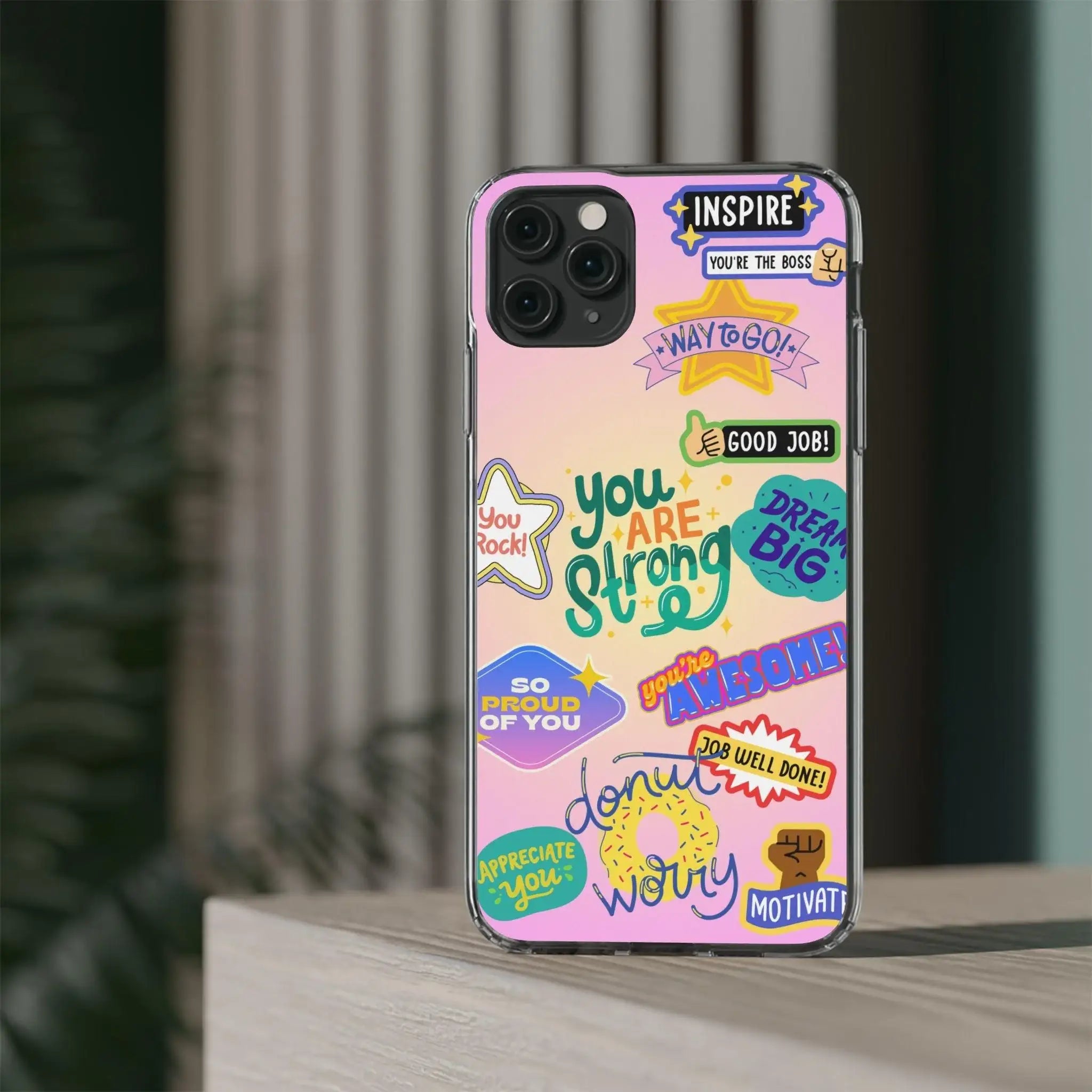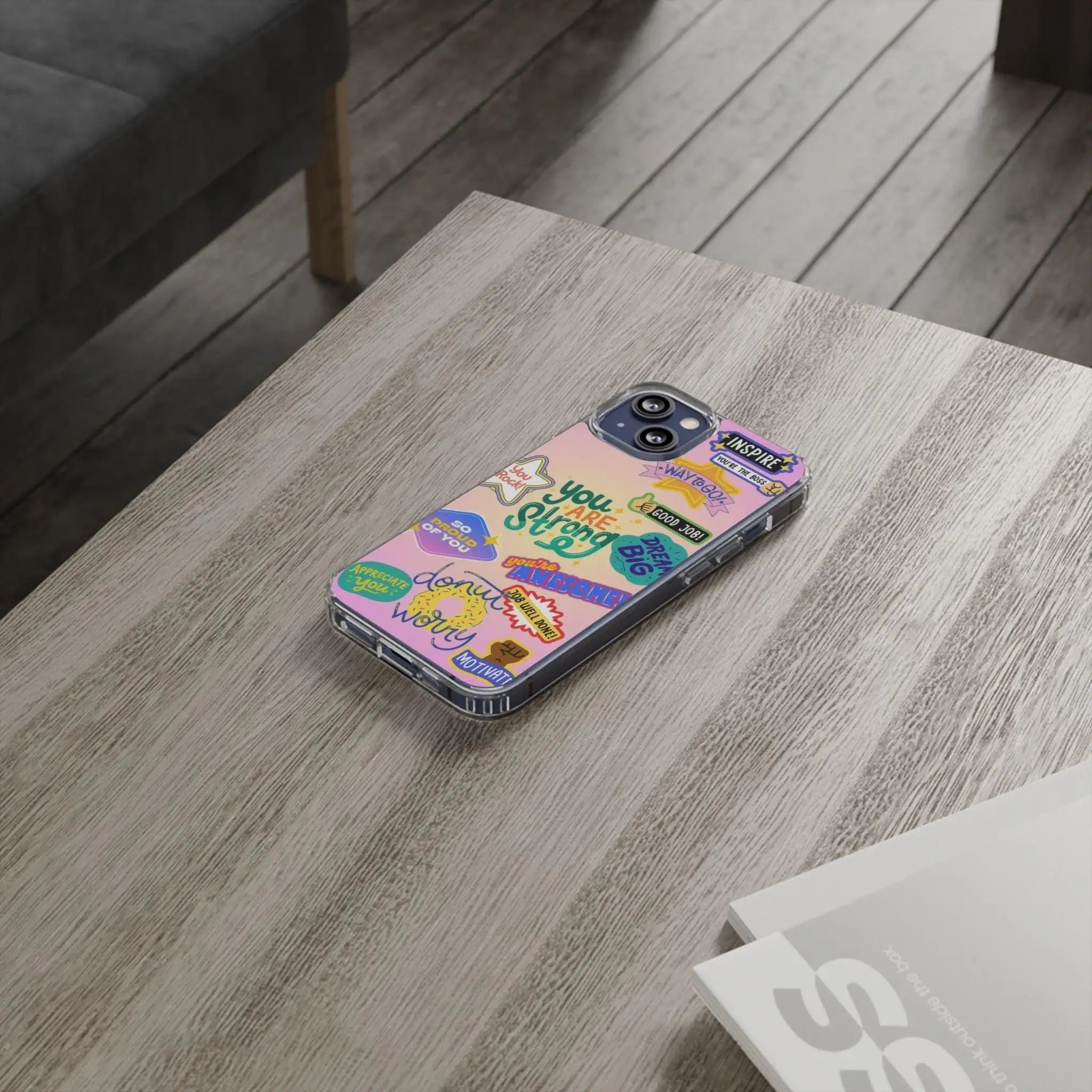 Boost your daily inspiration with the Motivational Stickers Clear Case, a phone case designed to empower and uplift you with every glance. This case features a collection of fun, eye-catching stickers, each showcasing a unique motivational phrase or positive affirmation in vibrant colors and bold fonts. With phrases like “You Got This,” “Stay Positive,” and “Dream Big,” these stickers serve as a personal cheerleader, helping you stay focused, resilient, and optimistic throughout the day. The clear background lets your phone’s natural color shine through, giving each sticker a layered, collage-like effect that’s both lively and visually striking.