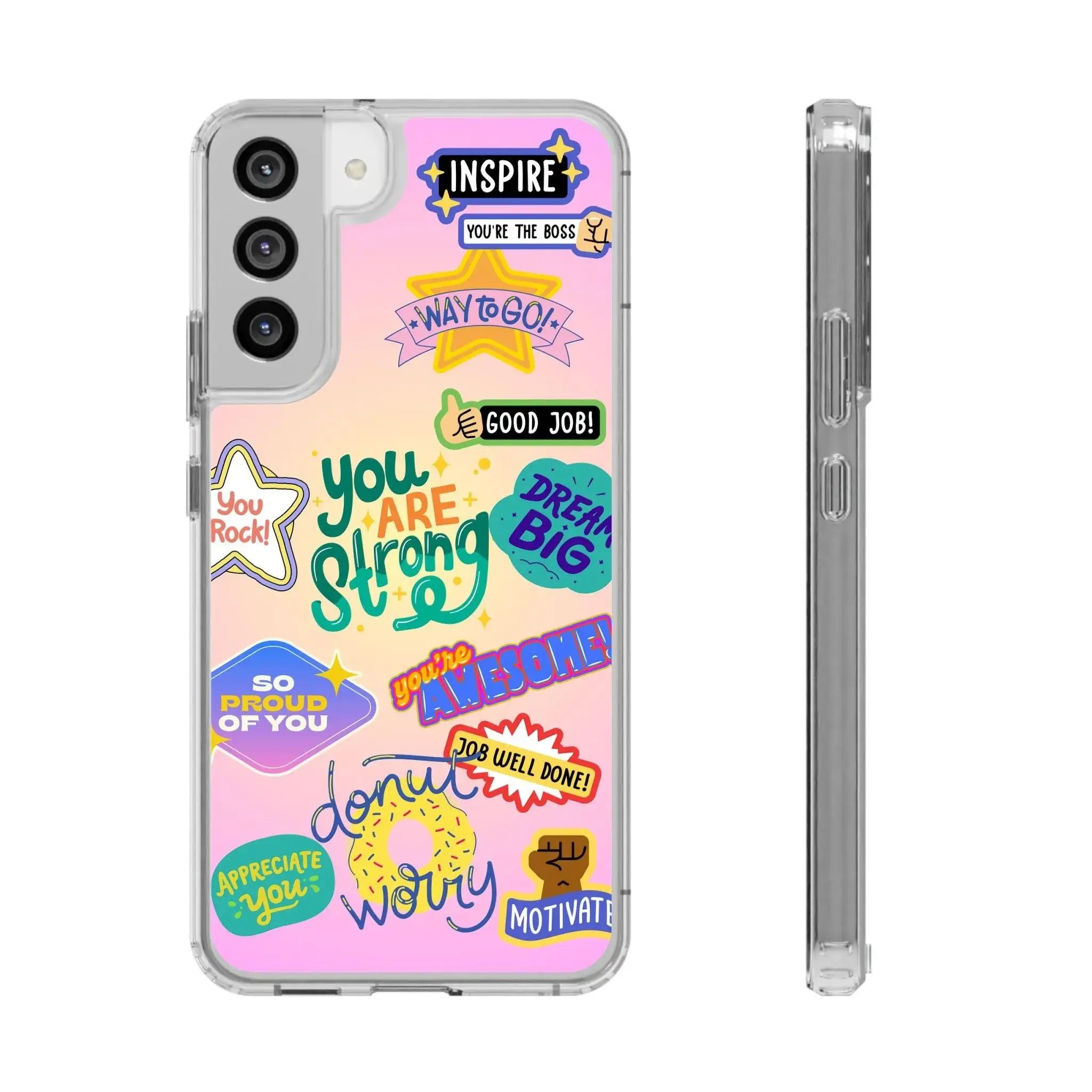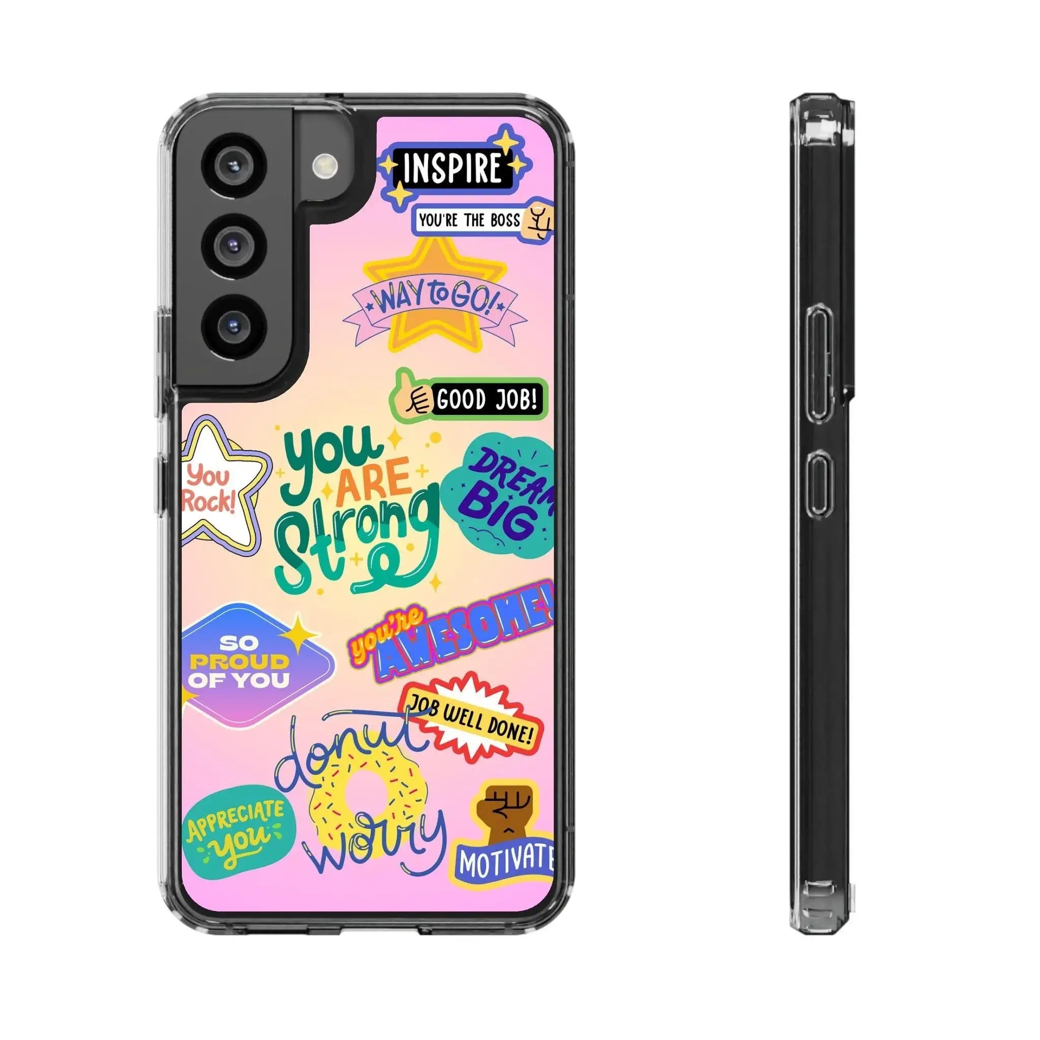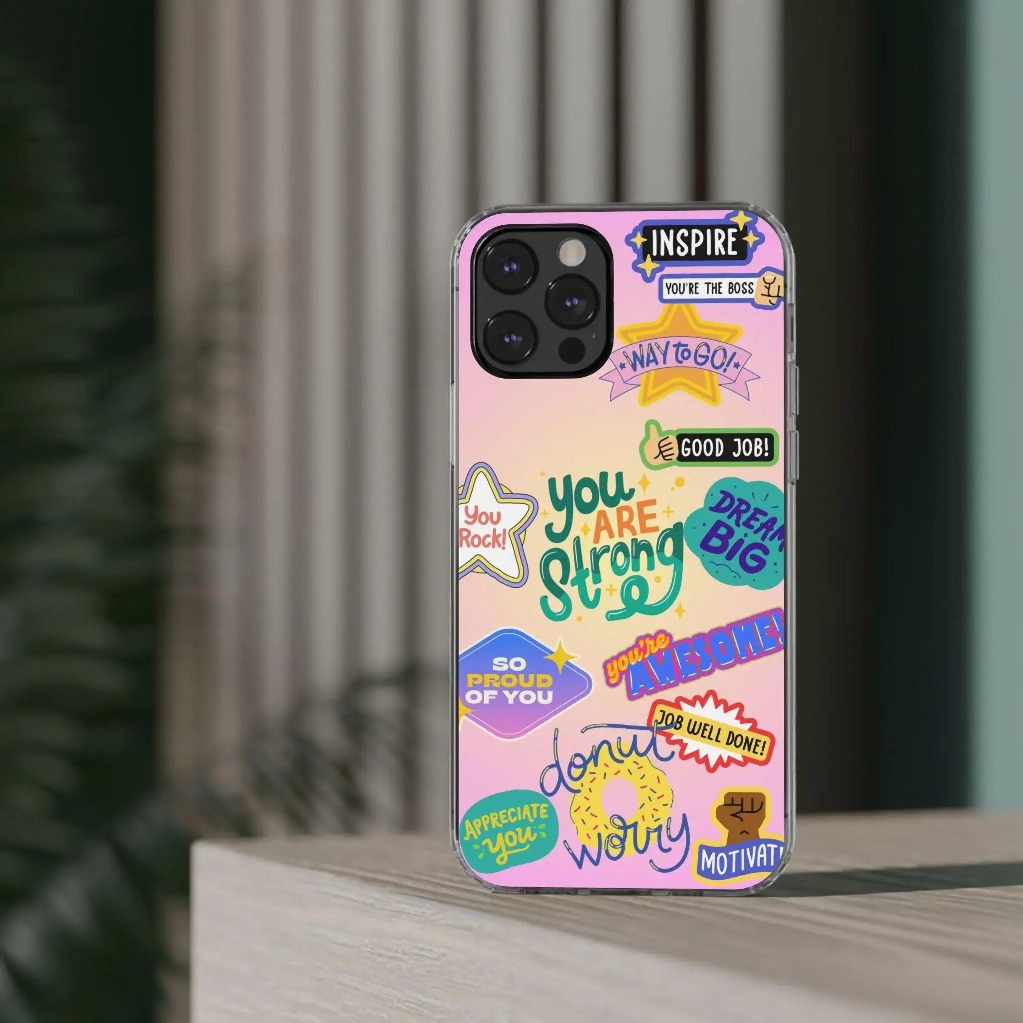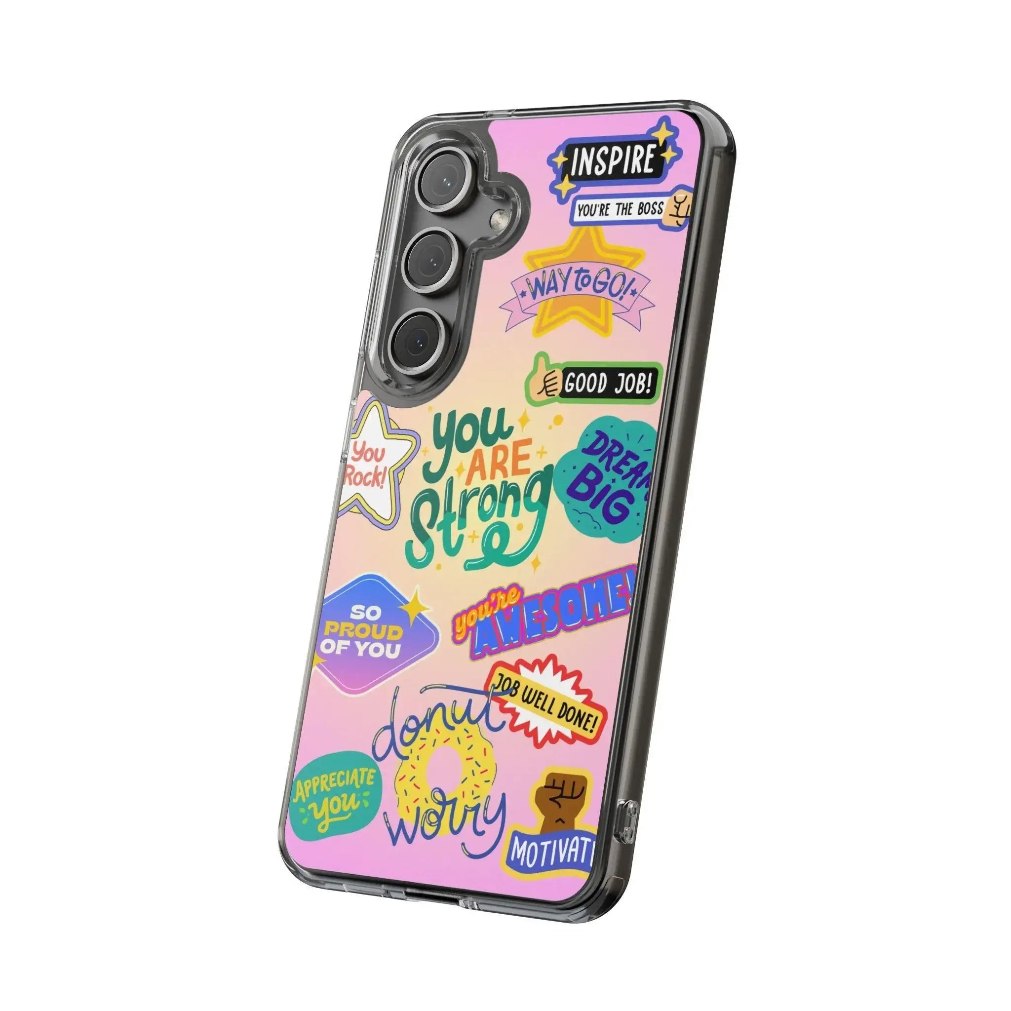 Boost your daily inspiration with the Motivational Stickers Clear Case, a phone case designed to empower and uplift you with every glance. This case features a collection of fun, eye-catching stickers, each showcasing a unique motivational phrase or positive affirmation in vibrant colors and bold fonts. With phrases like “You Got This,” “Stay Positive,” and “Dream Big,” these stickers serve as a personal cheerleader, helping you stay focused, resilient, and optimistic throughout the day. The clear background lets your phone’s natural color shine through, giving each sticker a layered, collage-like effect that’s both lively and visually striking.