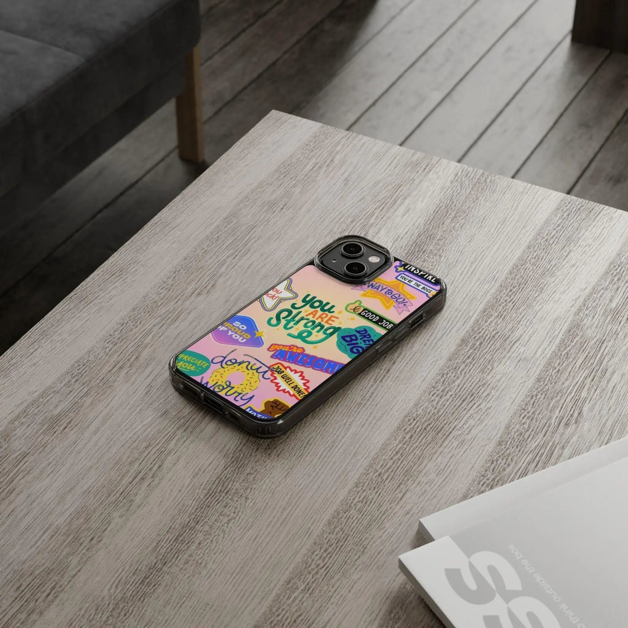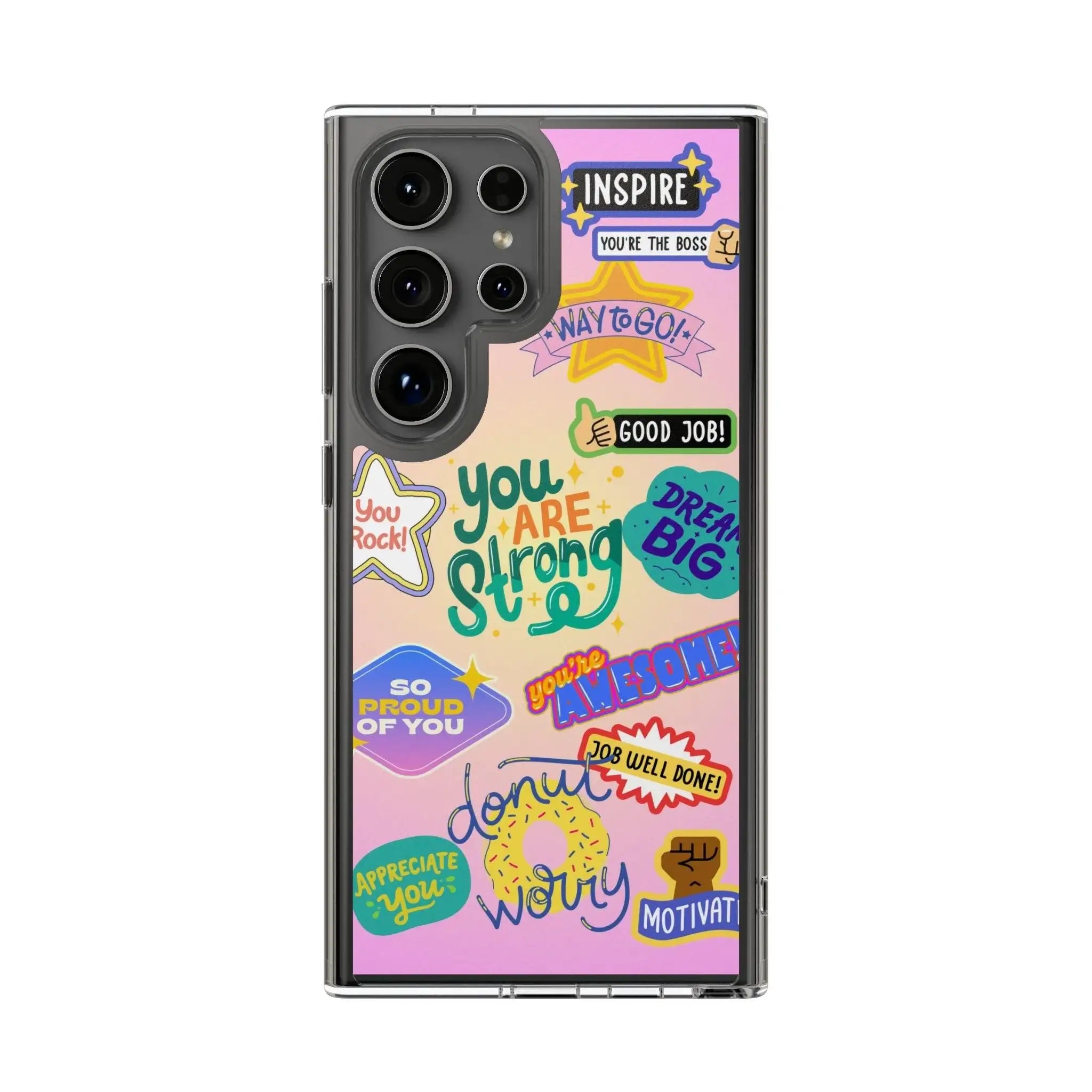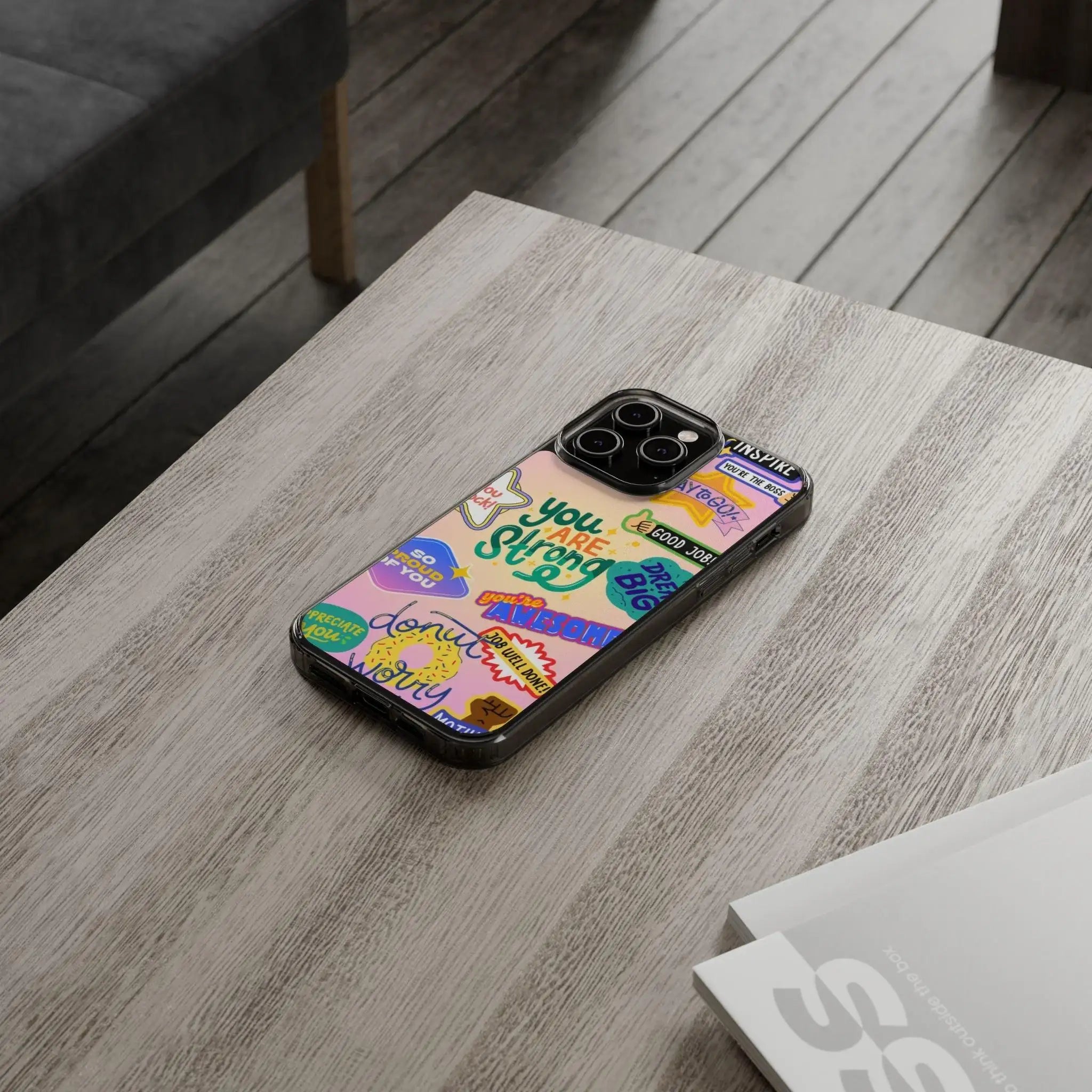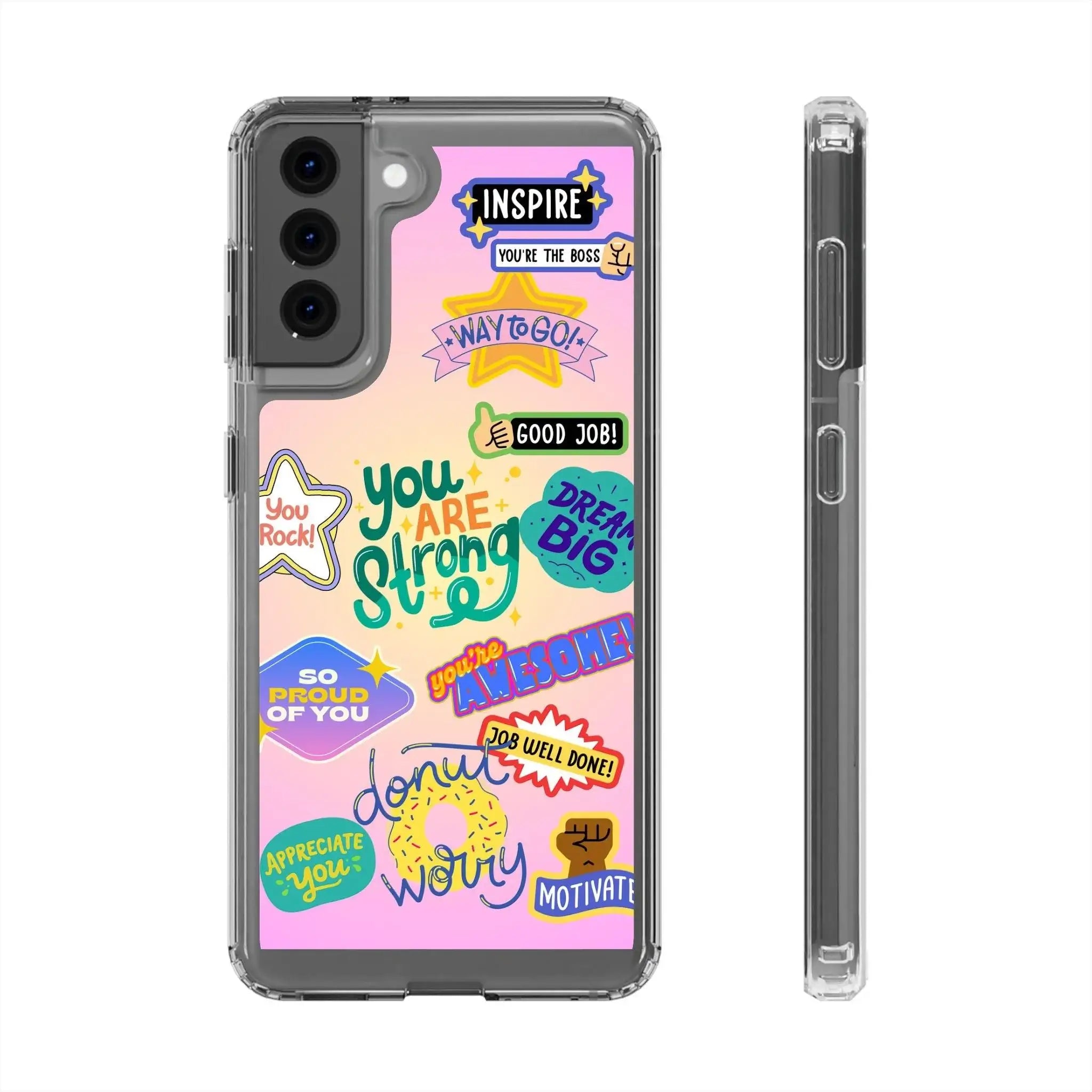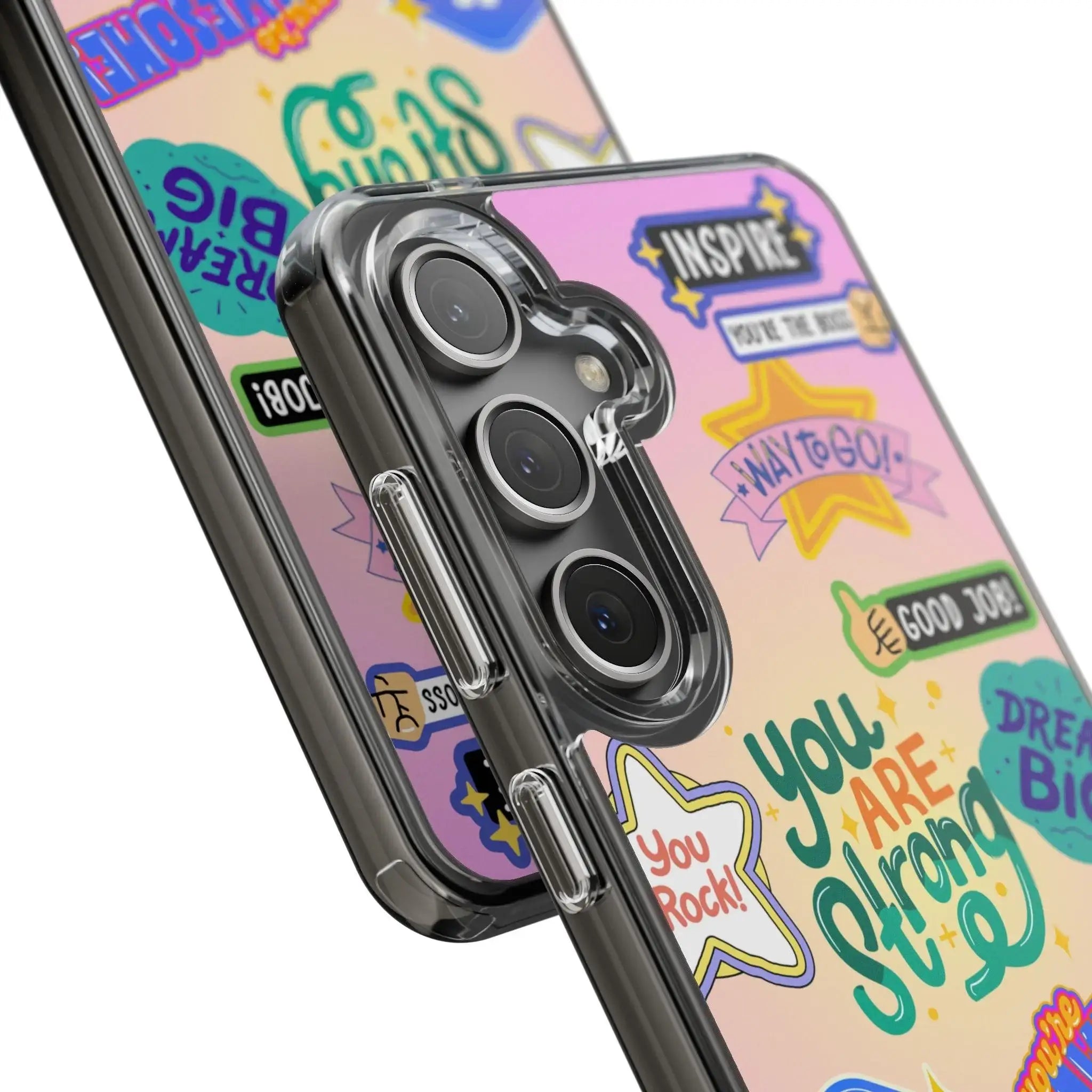 Boost your daily inspiration with the Motivational Stickers Clear Case, a phone case designed to empower and uplift you with every glance. This case features a collection of fun, eye-catching stickers, each showcasing a unique motivational phrase or positive affirmation in vibrant colors and bold fonts. With phrases like “You Got This,” “Stay Positive,” and “Dream Big,” these stickers serve as a personal cheerleader, helping you stay focused, resilient, and optimistic throughout the day. The clear background lets your phone’s natural color shine through, giving each sticker a layered, collage-like effect that’s both lively and visually striking.