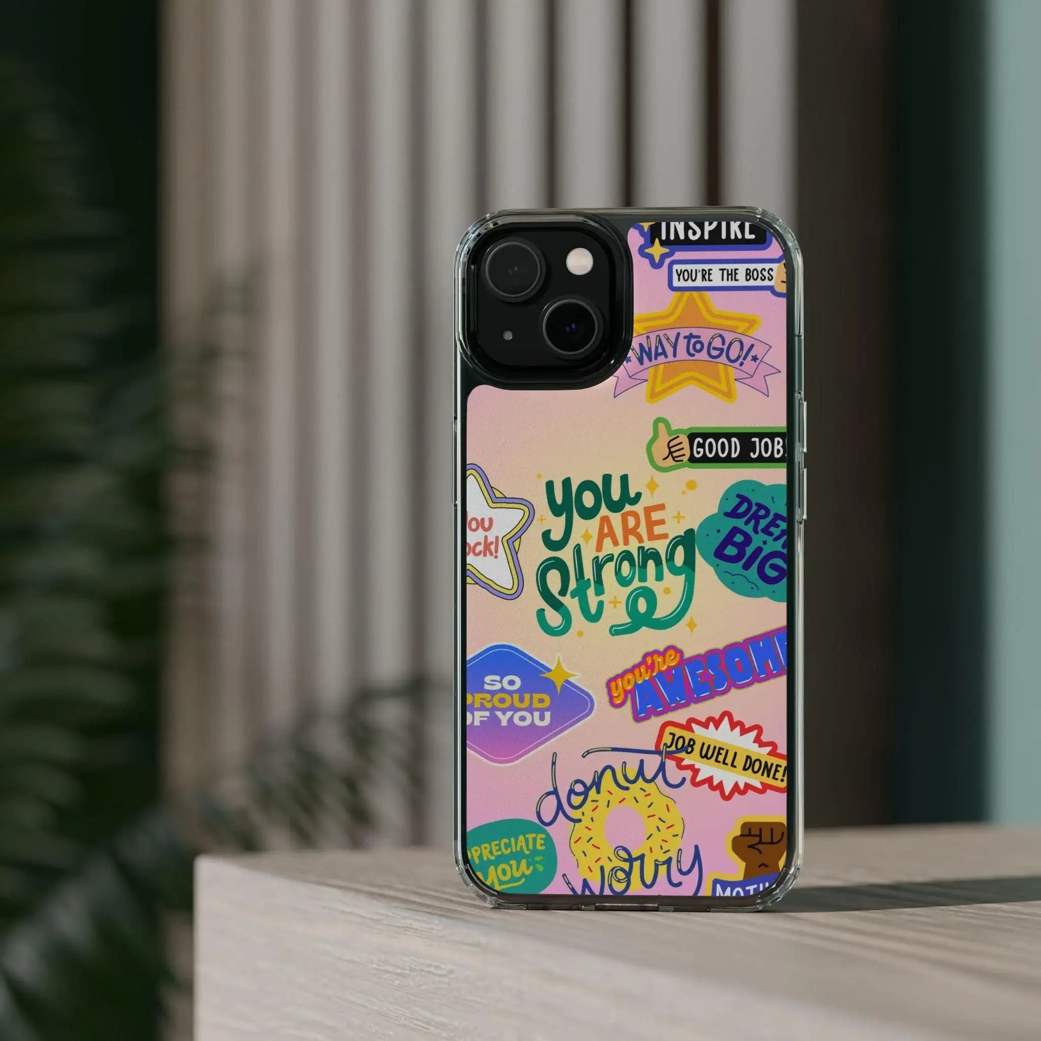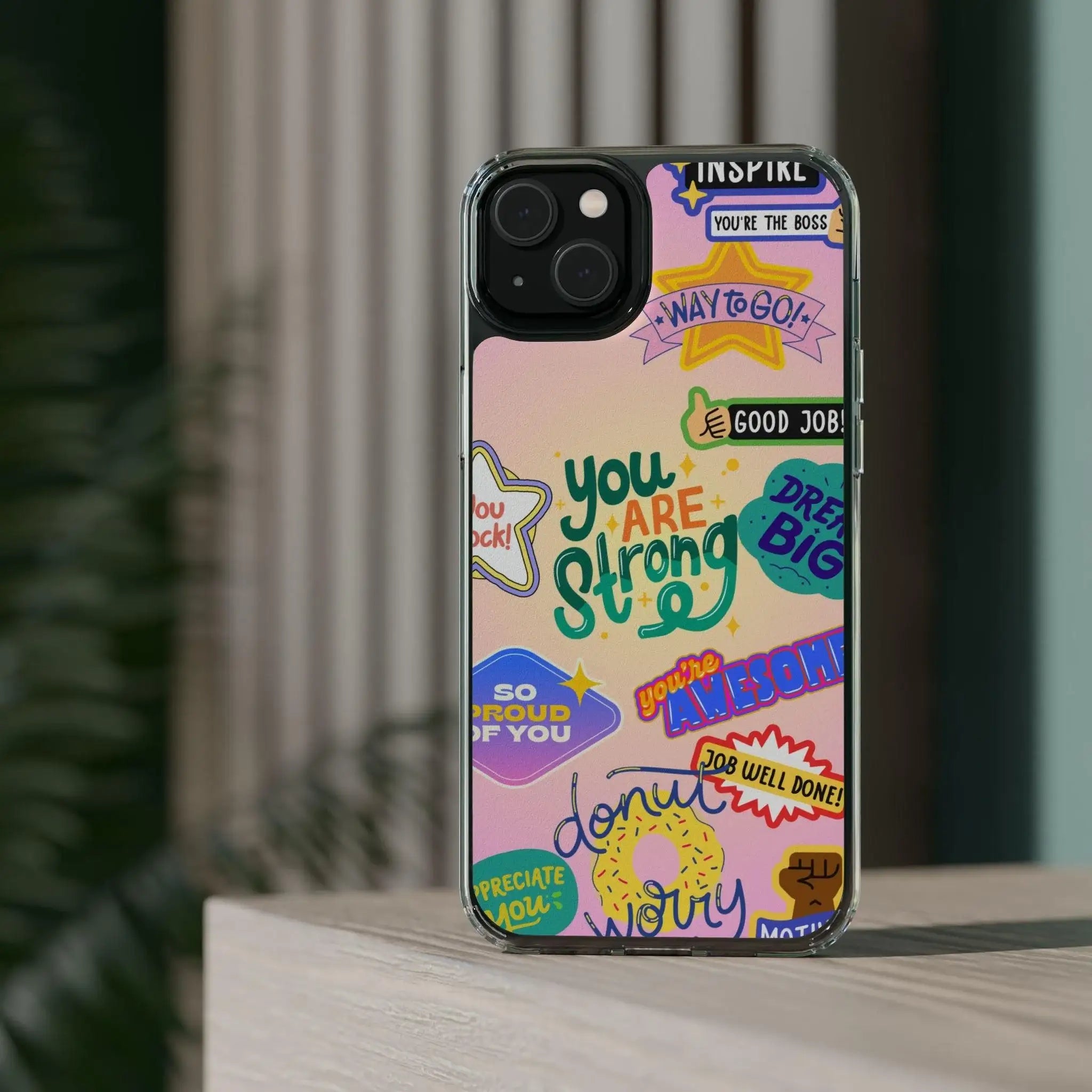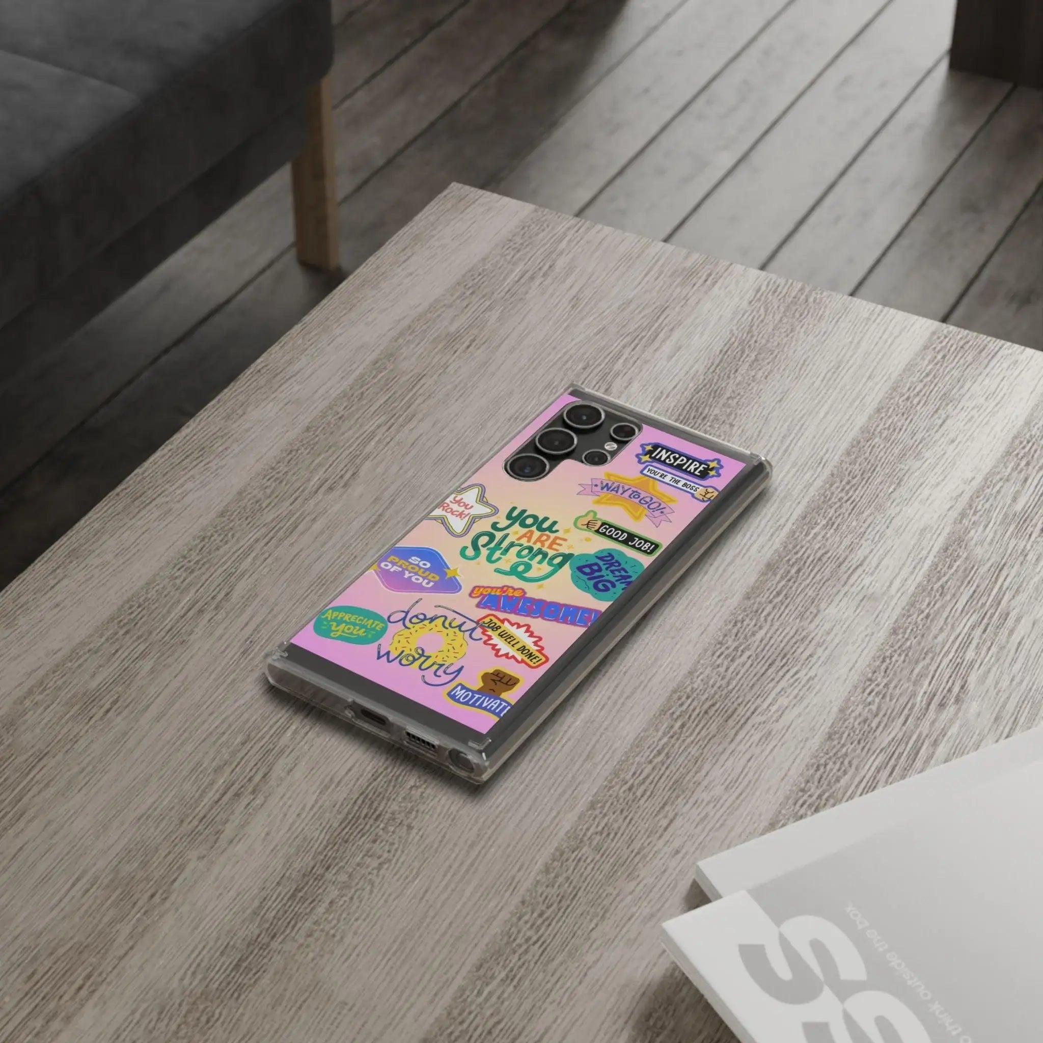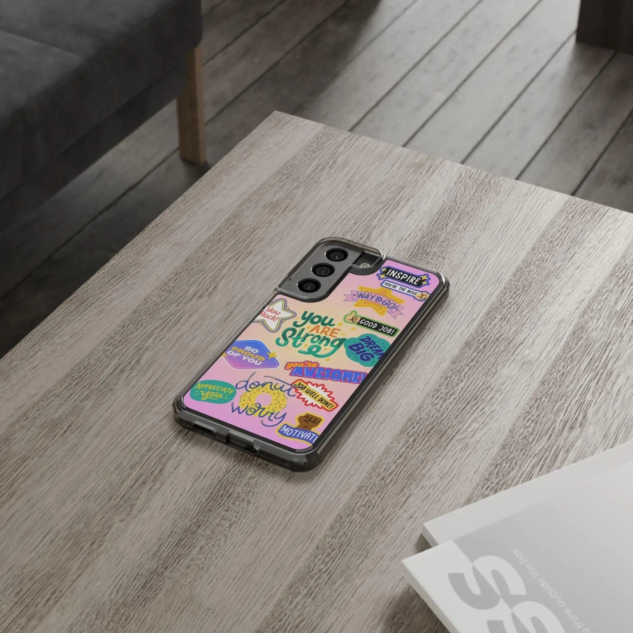 Boost your daily inspiration with the Motivational Stickers Clear Case, a phone case designed to empower and uplift you with every glance. This case features a collection of fun, eye-catching stickers, each showcasing a unique motivational phrase or positive affirmation in vibrant colors and bold fonts. With phrases like “You Got This,” “Stay Positive,” and “Dream Big,” these stickers serve as a personal cheerleader, helping you stay focused, resilient, and optimistic throughout the day. The clear background lets your phone’s natural color shine through, giving each sticker a layered, collage-like effect that’s both lively and visually striking.