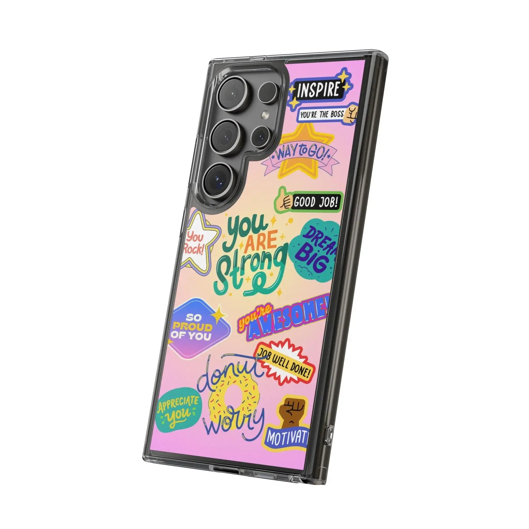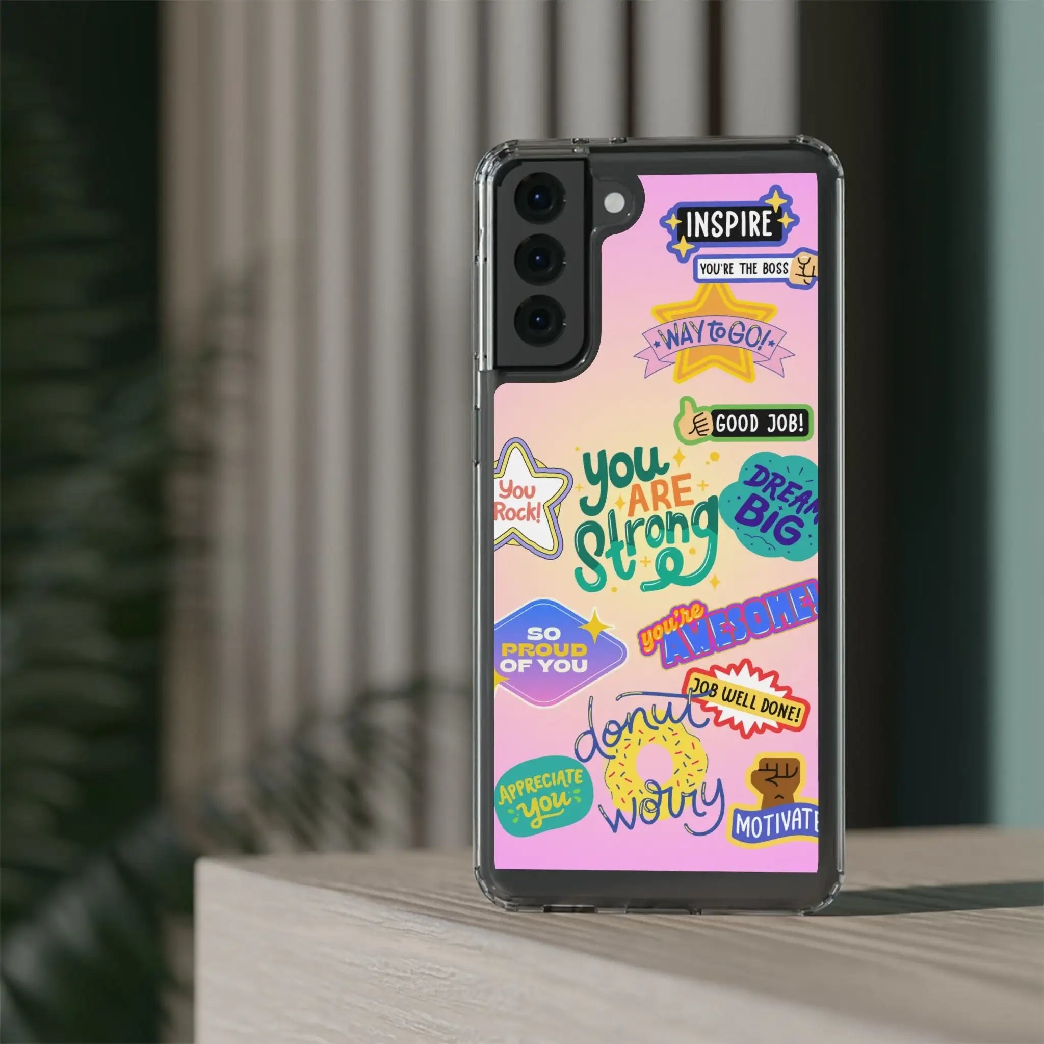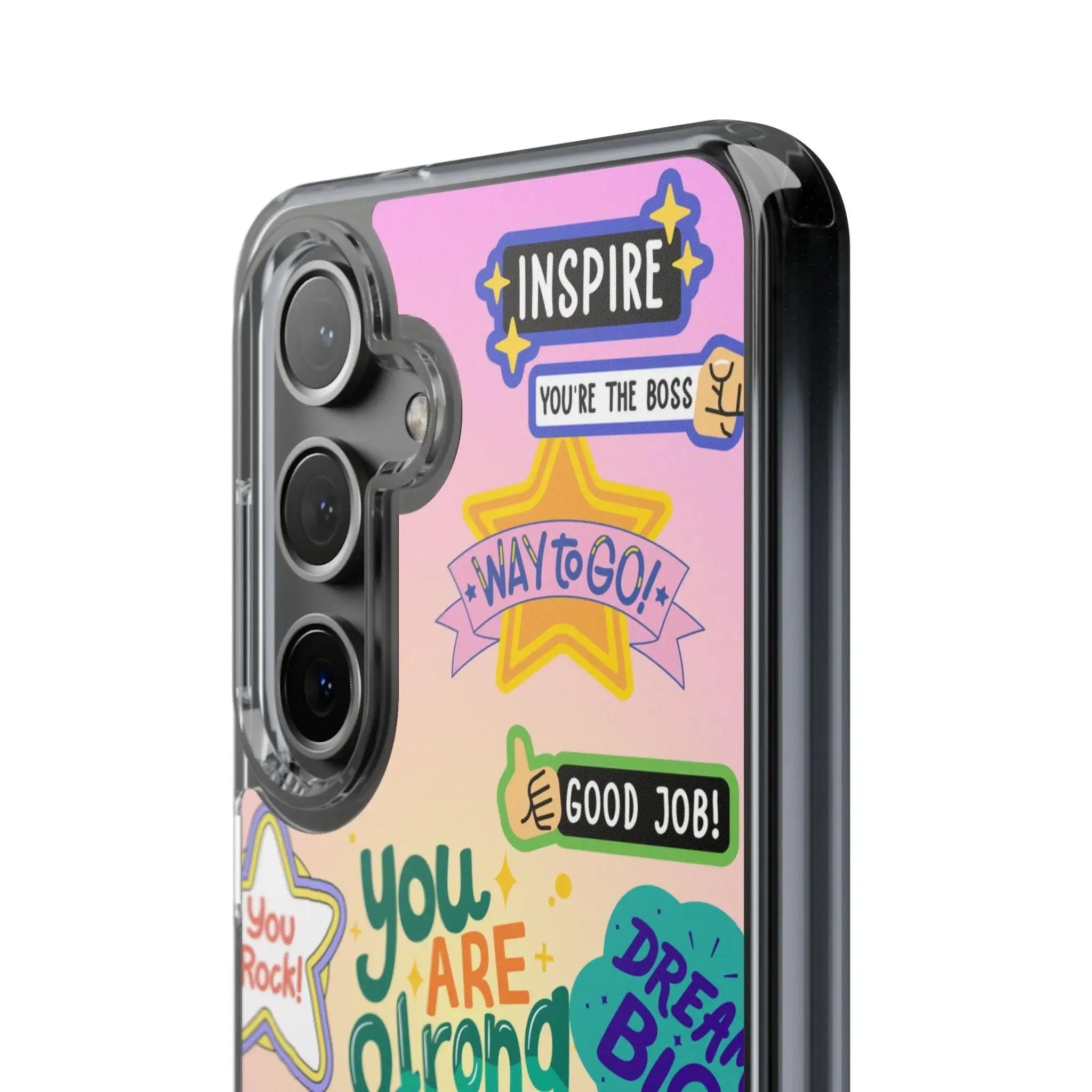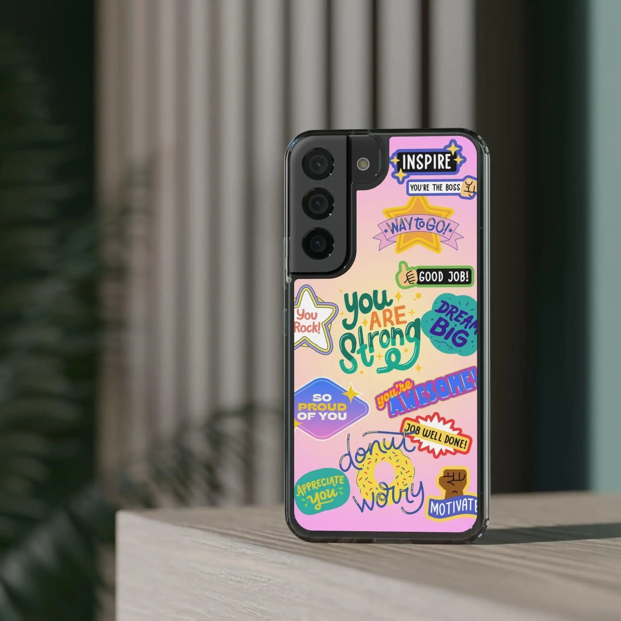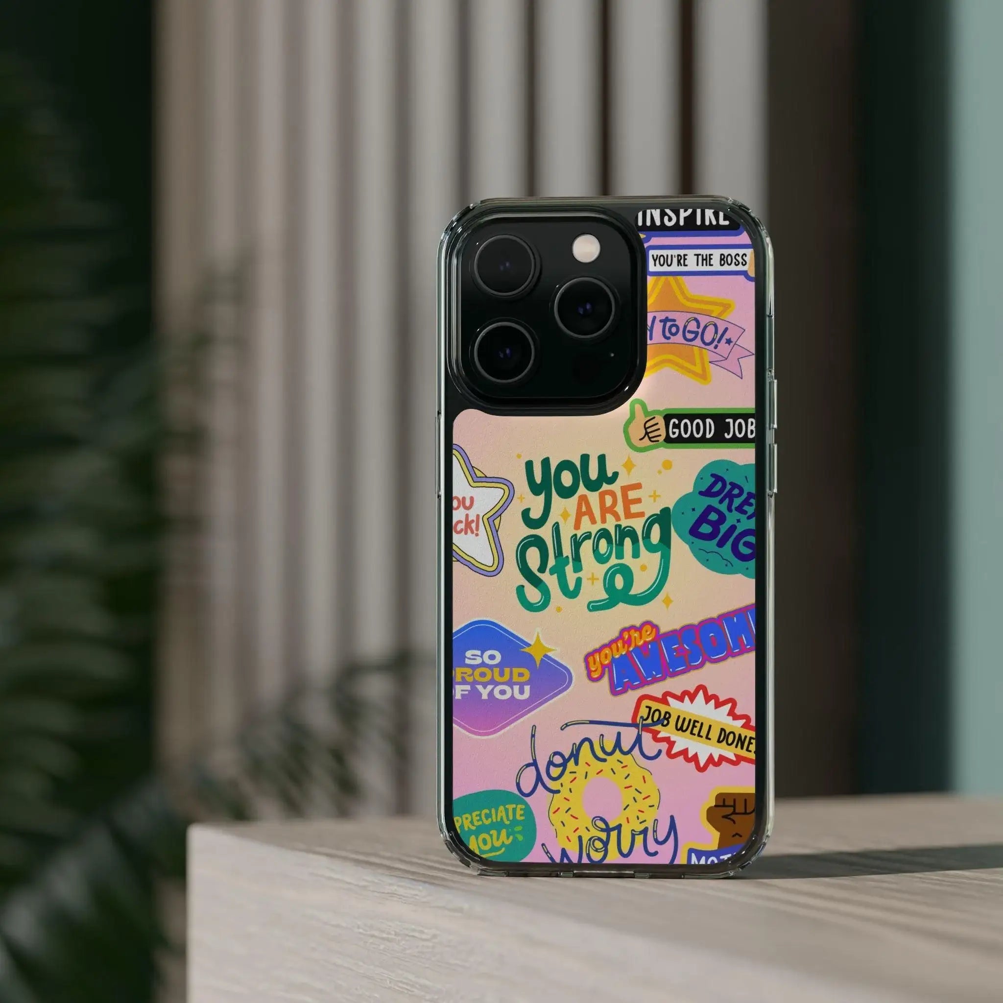 Boost your daily inspiration with the Motivational Stickers Clear Case, a phone case designed to empower and uplift you with every glance. This case features a collection of fun, eye-catching stickers, each showcasing a unique motivational phrase or positive affirmation in vibrant colors and bold fonts. With phrases like “You Got This,” “Stay Positive,” and “Dream Big,” these stickers serve as a personal cheerleader, helping you stay focused, resilient, and optimistic throughout the day. The clear background lets your phone’s natural color shine through, giving each sticker a layered, collage-like effect that’s both lively and visually striking.