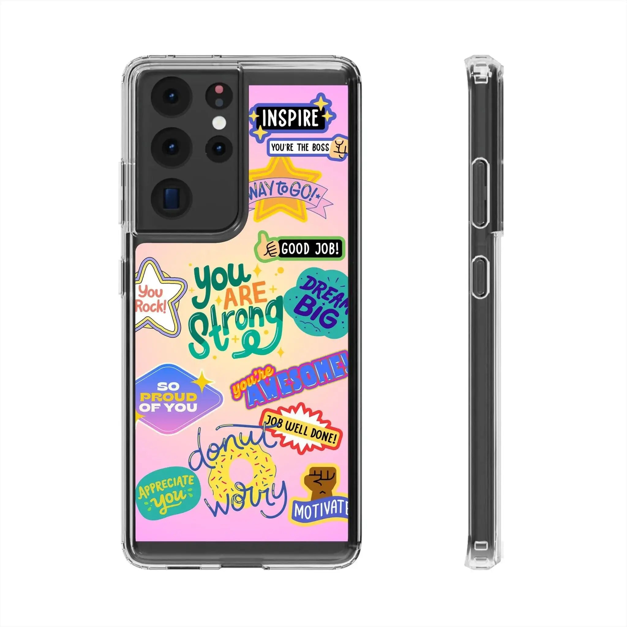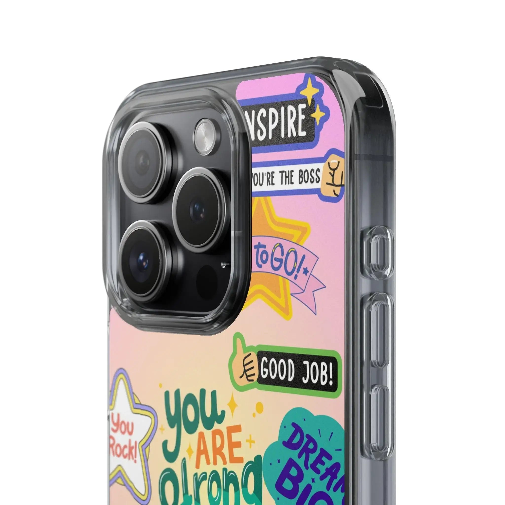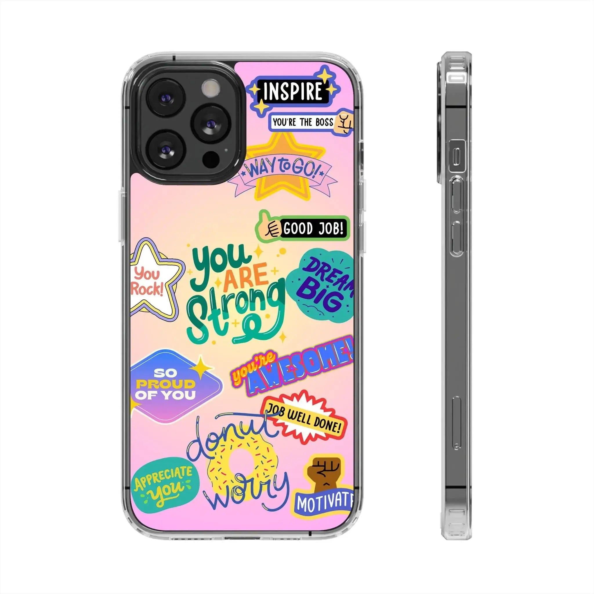 In addition to its inspirational look, this case is designed for maximum convenience, with precise cutouts for easy access to all buttons, ports, and cameras. The Motivational Stickers Clear Case is perfect for go-getters, dreamers, or anyone who loves spreading positivity. Not only does it protect your phone, but it also brings a burst of encouragement and style wherever you go.