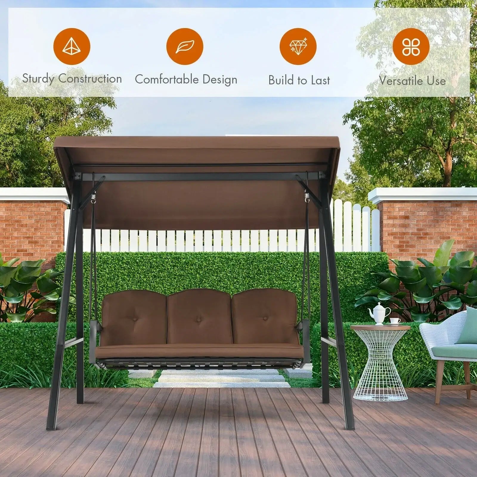 Outdoor 3-Seat Porch Swing with Adjust Canopy and Cushions-Coffee