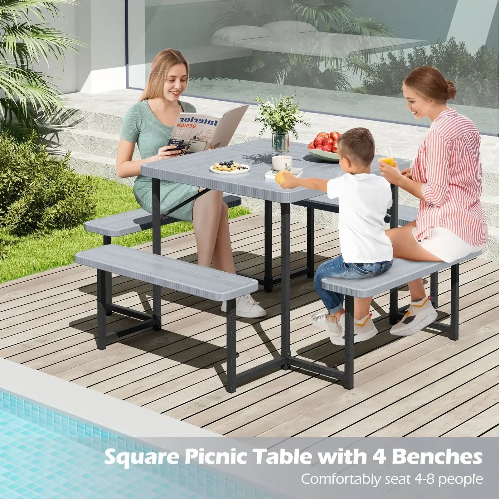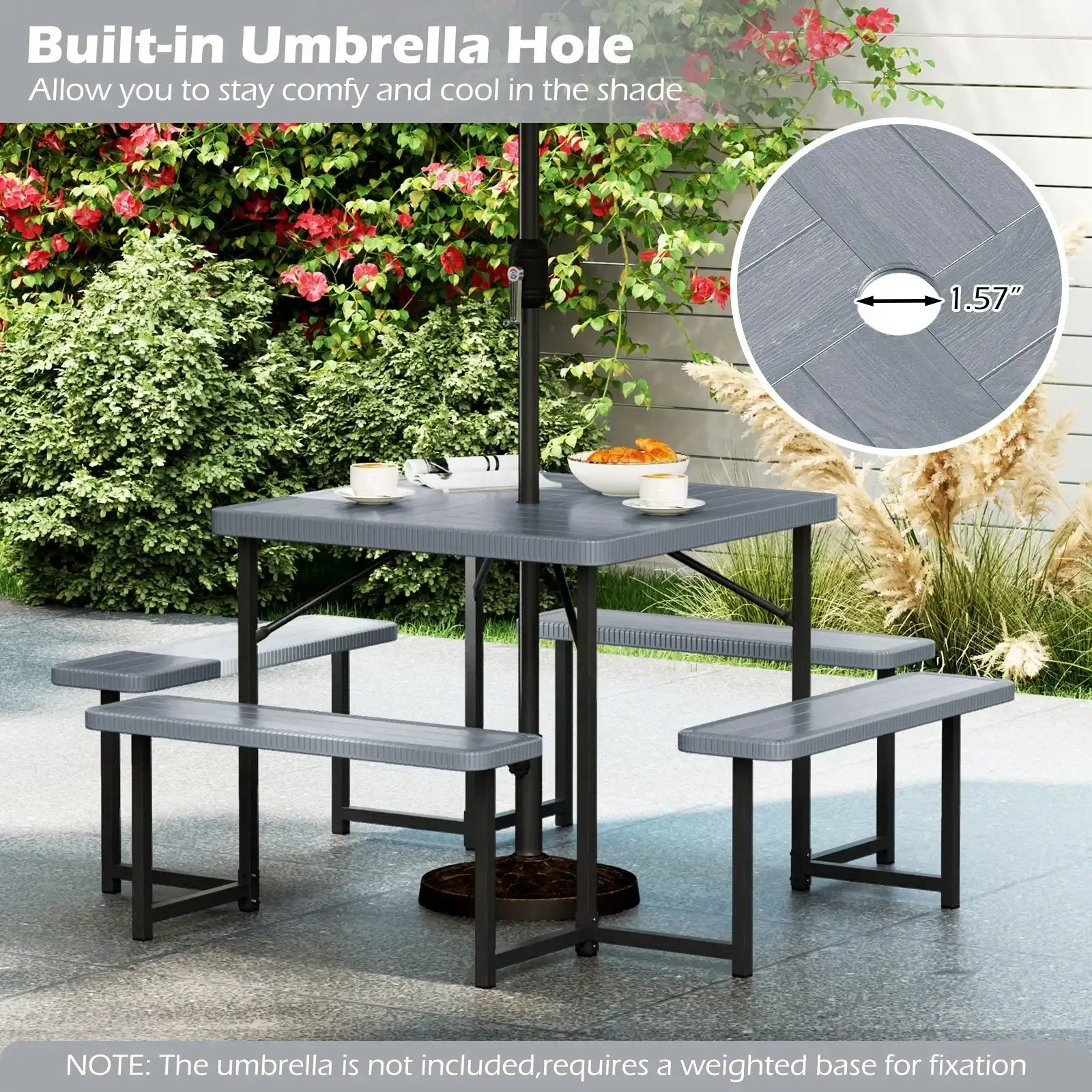 Outdoor Square Picnic Table Bench Set for 4-8 People with Umbrella Hole-Gray