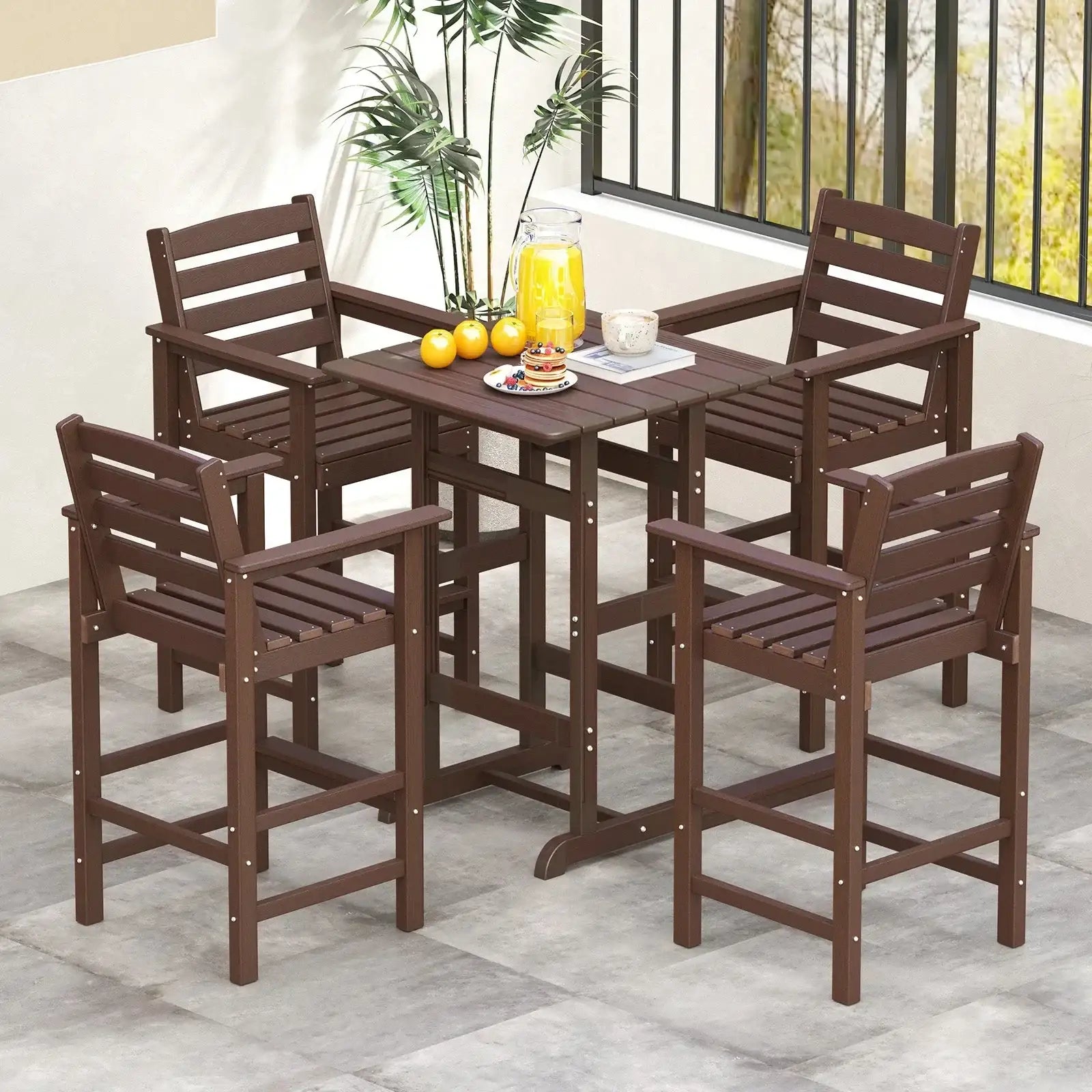 ● Made of high-quality HDPE for prolonged service life● Reinforced crossbars for added stability● Stainless steel screws for firm connection and longer using time● Cozy to sit with inclined backrest wide armrests and footrest● Slatted seat is breathable to sit and easy to maintain● Wood-like texture adds more elegance● Suitable for 39.5" to 45.5" bar height table● Perfect for backyard porch balcony and so on● Assembly is required