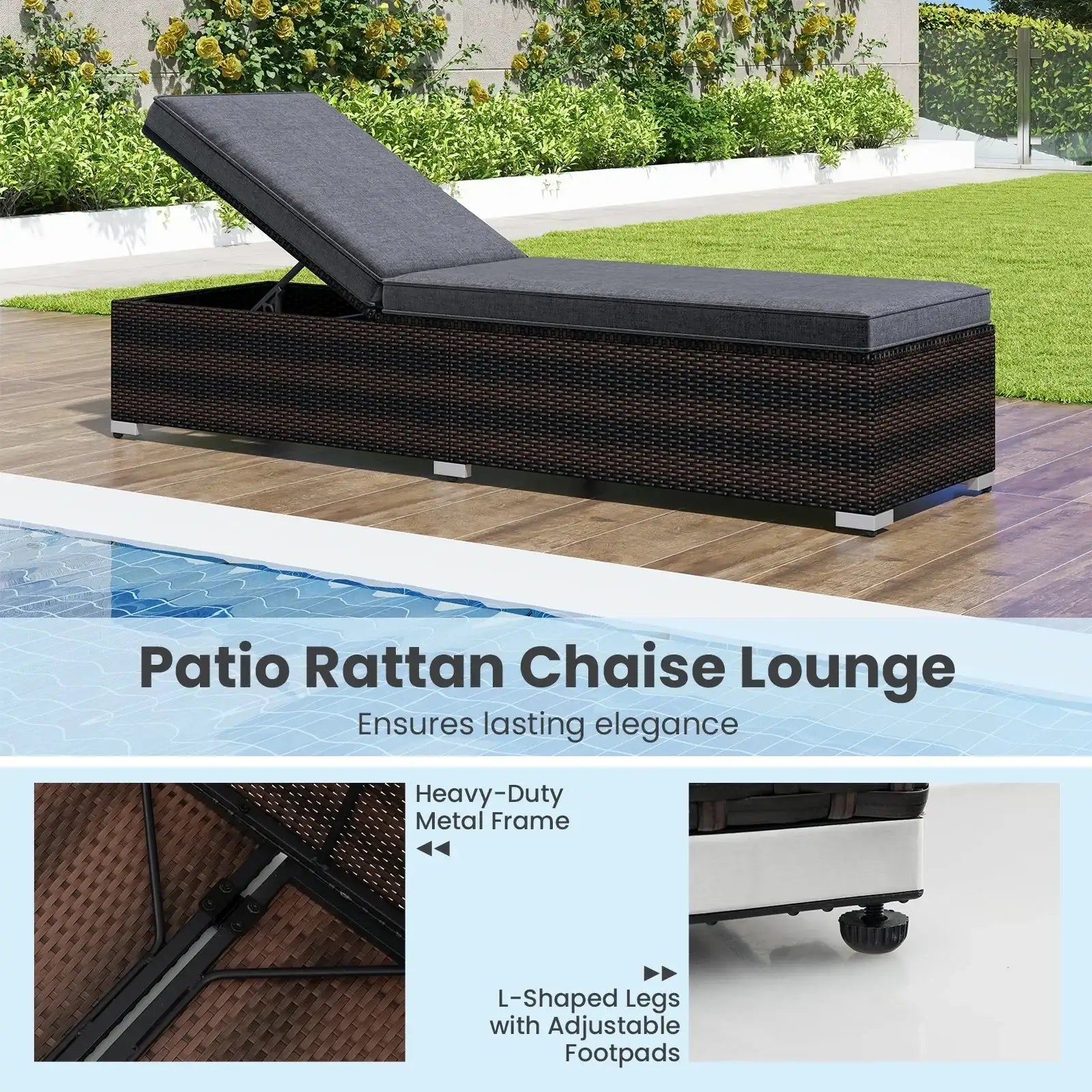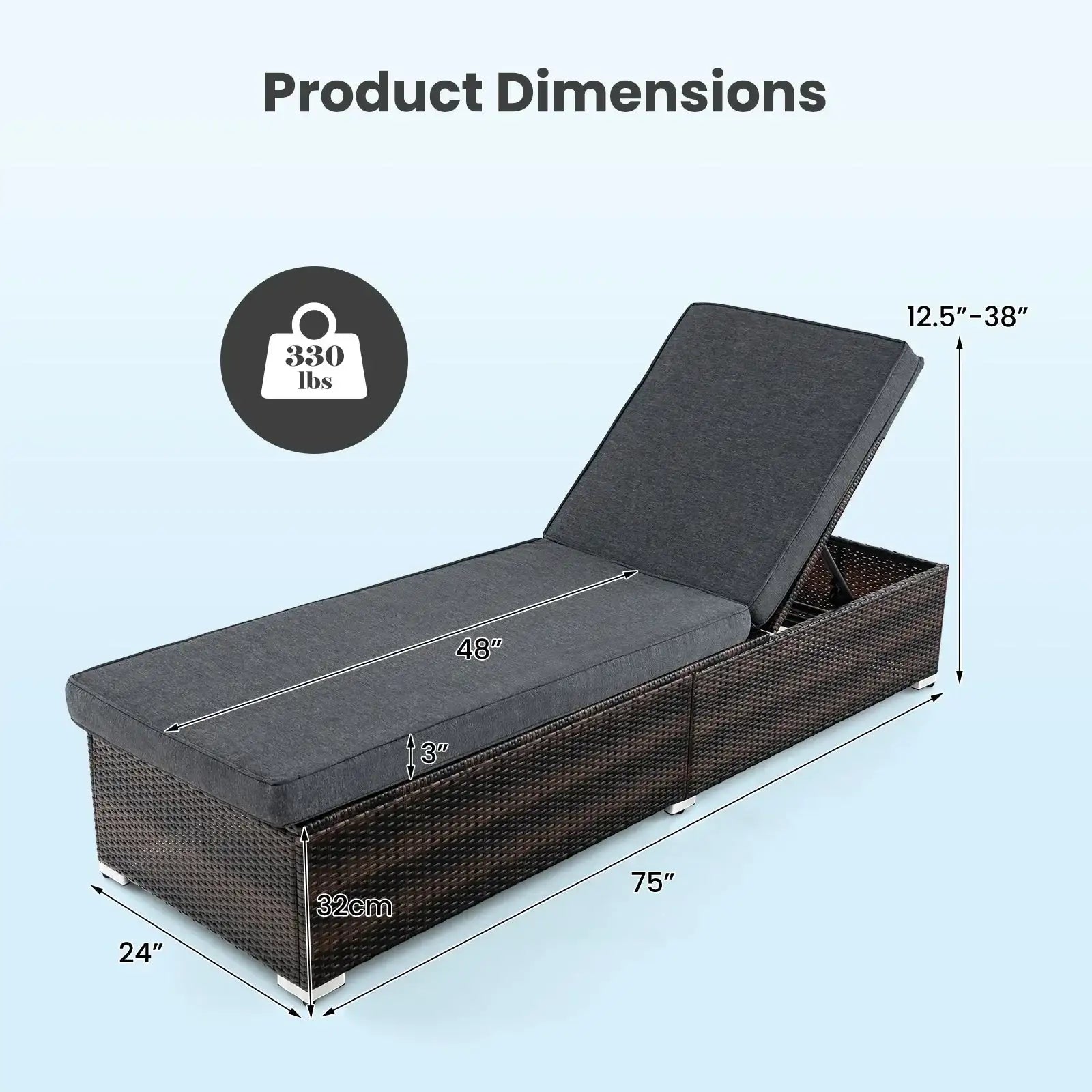 ● 4-position backrest adjusts for custom comfort● Well-woven PE rattan ensures lasting elegance● Luxurious cushion with soft and elastic filling enhances comfort● Zippered cover makes maintenance quite simple● Heavy-duty metal frame supports up to 330 lbs● Versatile design fits any outdoor setting beautifully● Cushion features secure-fit design to prevent slipping● Please avoid rain exposure for prolonged service life