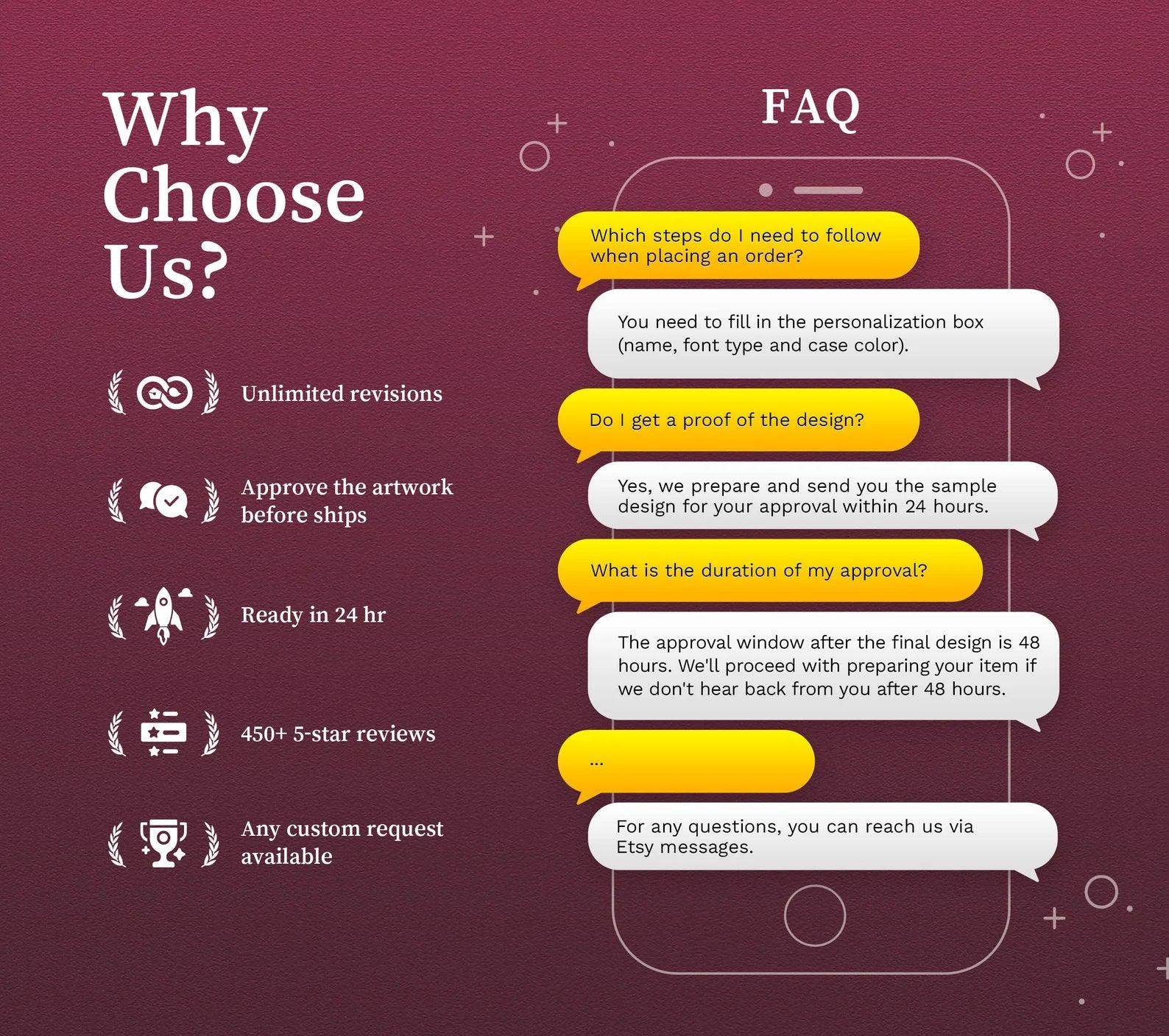 2- We will send you the sample within 24 hours after of your purchase before printing your phone case and will ask you to confirm if the design satisfies you. The approval window after the final design is 48 hours. We'll proceed with preparing your item if we don't hear back from you after 48 hours.