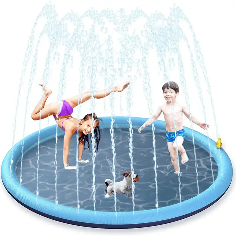• DURABLE MATERIAL- The dog sprinkler pad is made of high-quality PVC, thicker than others; BPA free and non-slip material is safe for puppies. The fountain spray mat with many water holes provides a good fountain to play with water.
