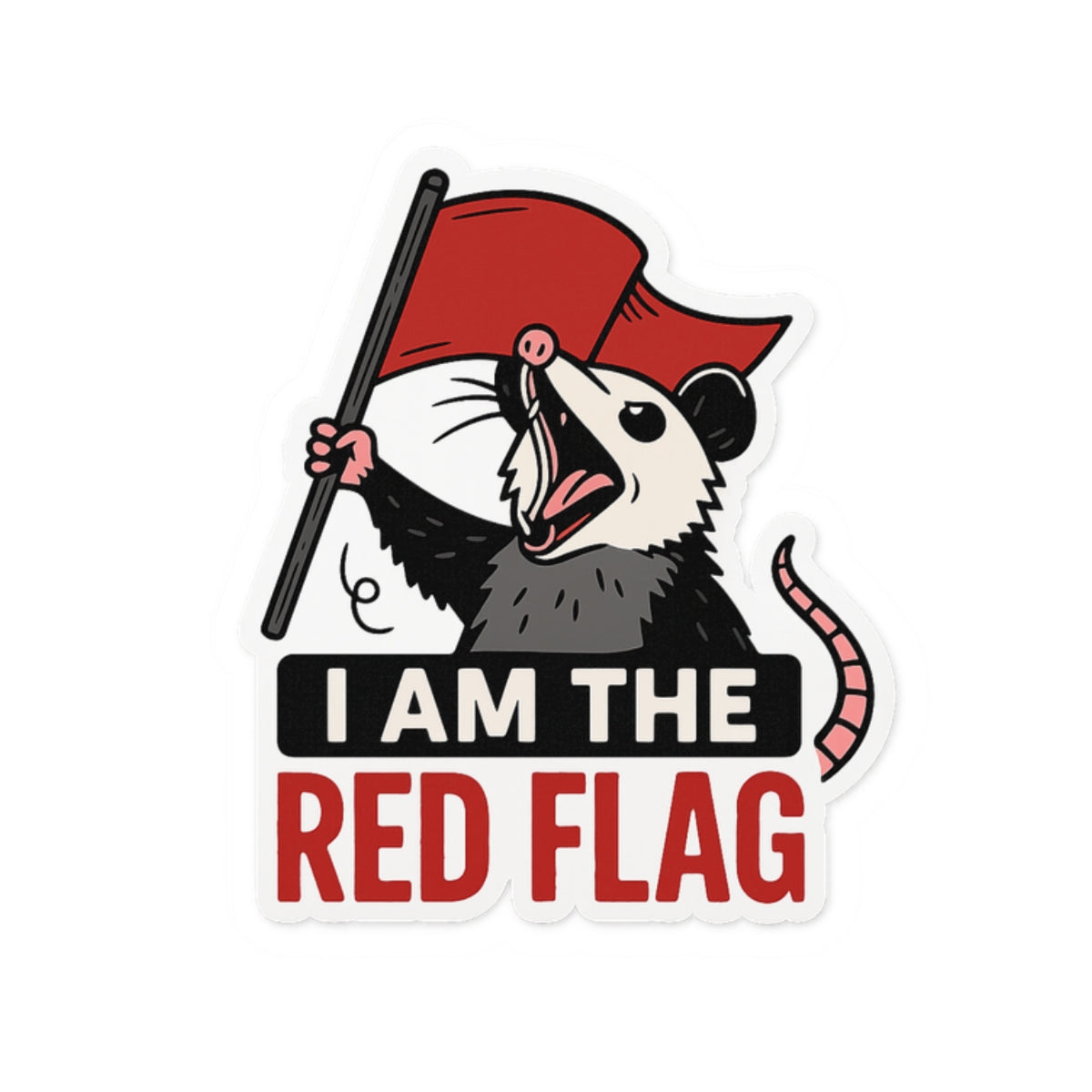 Wave your chaos loud and proud with this “I Am the Red Flag” sticker – featuring a defiant possum screaming into the void while holding a literal red flag. Designed for the delightfully unhinged, emotionally chaotic, and self-aware troublemakers, this bold vinyl decal is the perfect declaration of feral pride.