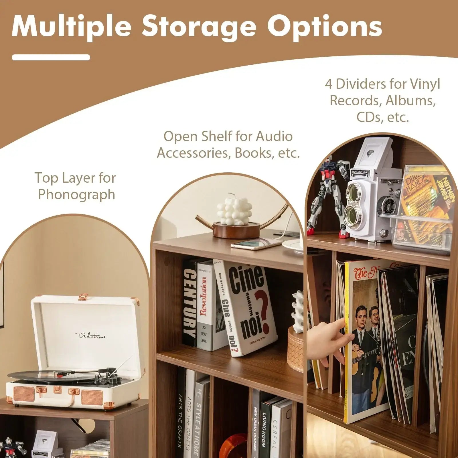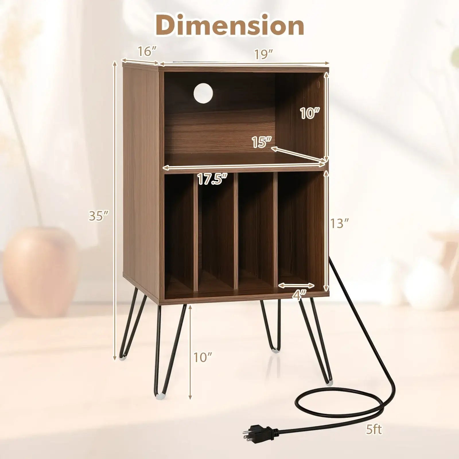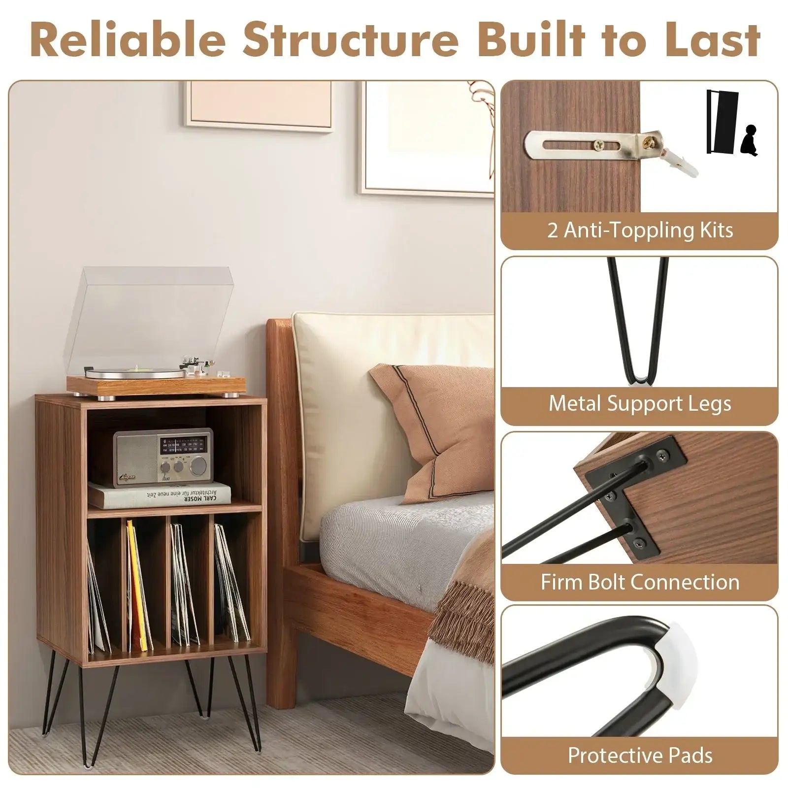 ● With intimate charging station to keep your devices powered up● 3-tier design provides generous storage space for your vinyl collection● Showcase your favorite records and keep them organized● 2 anti-toppling kits prevent wobbling and improve safety● Metal support legs are not easy to deform or shake● Comes with protective pads to avoid scratches● Firm bolt connection for enhanced stability and reliable usage● With a cable management hole to prevent clutter● Modern design coordinates well with existing home decorations● Used as an album organizer turntable stand or display shelf