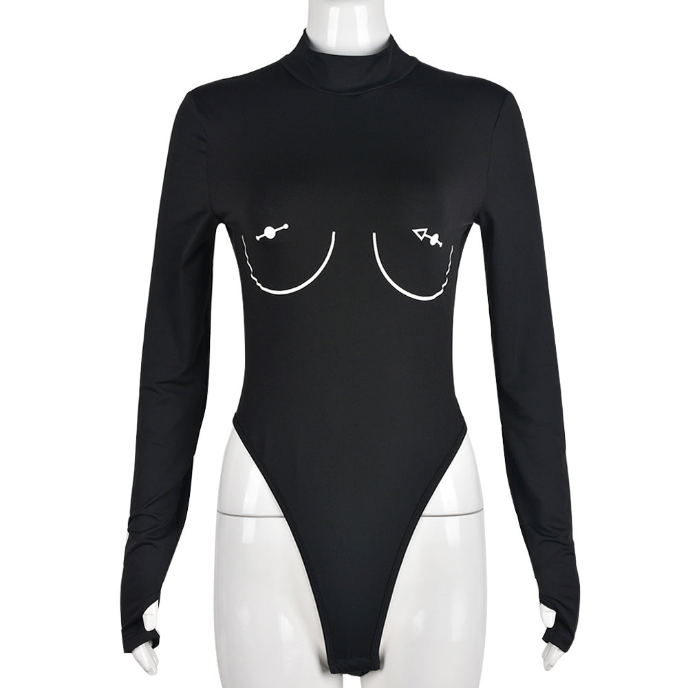 Sexy Long Sleeved Printed High Elastic Bodysuit Hollow Out Cutout Women Top
