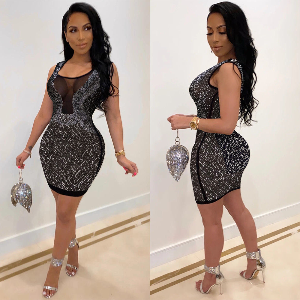 Sexy Slim-Fit Rhinestone See-through Dress Nightclub Uniforms
