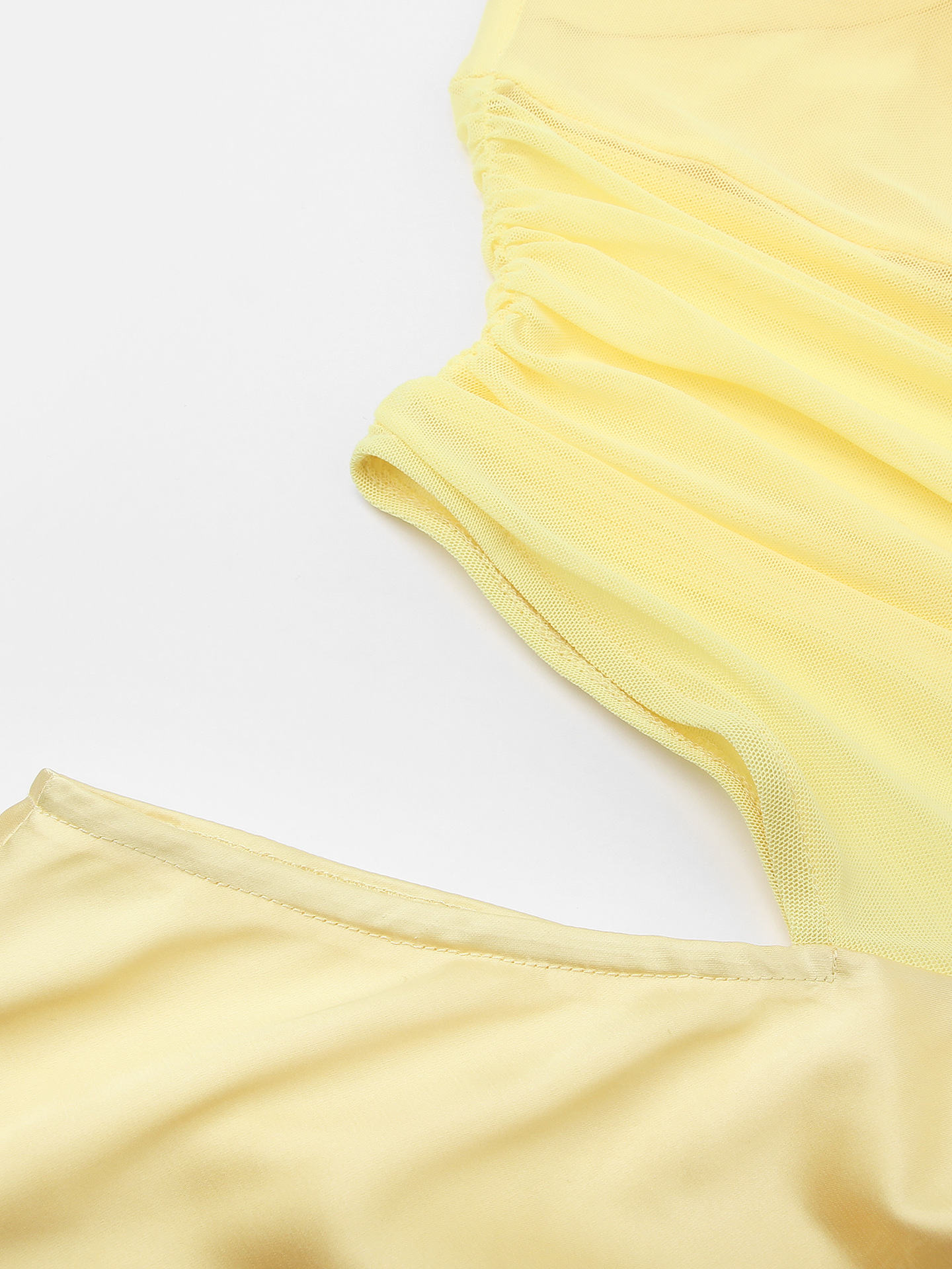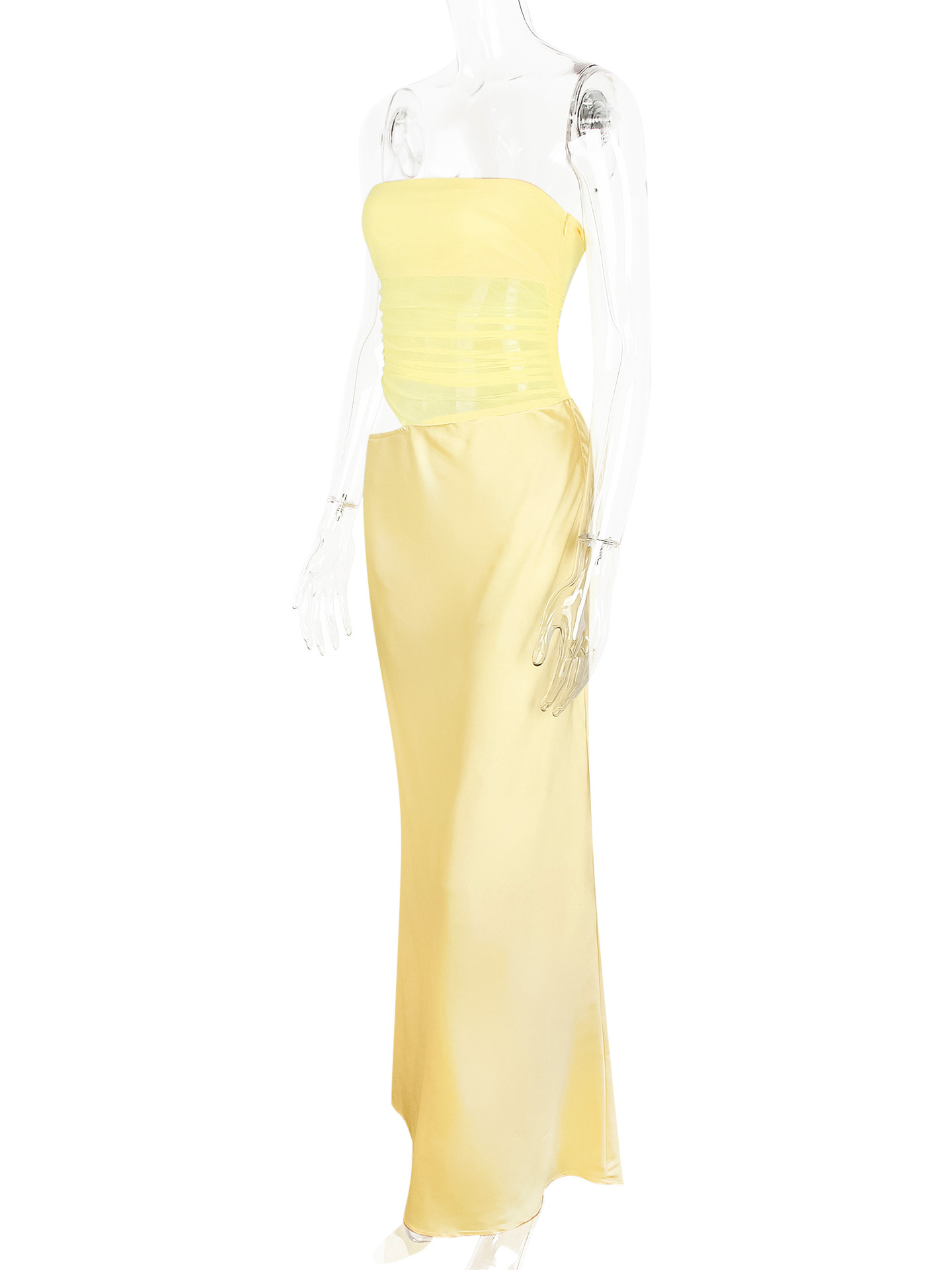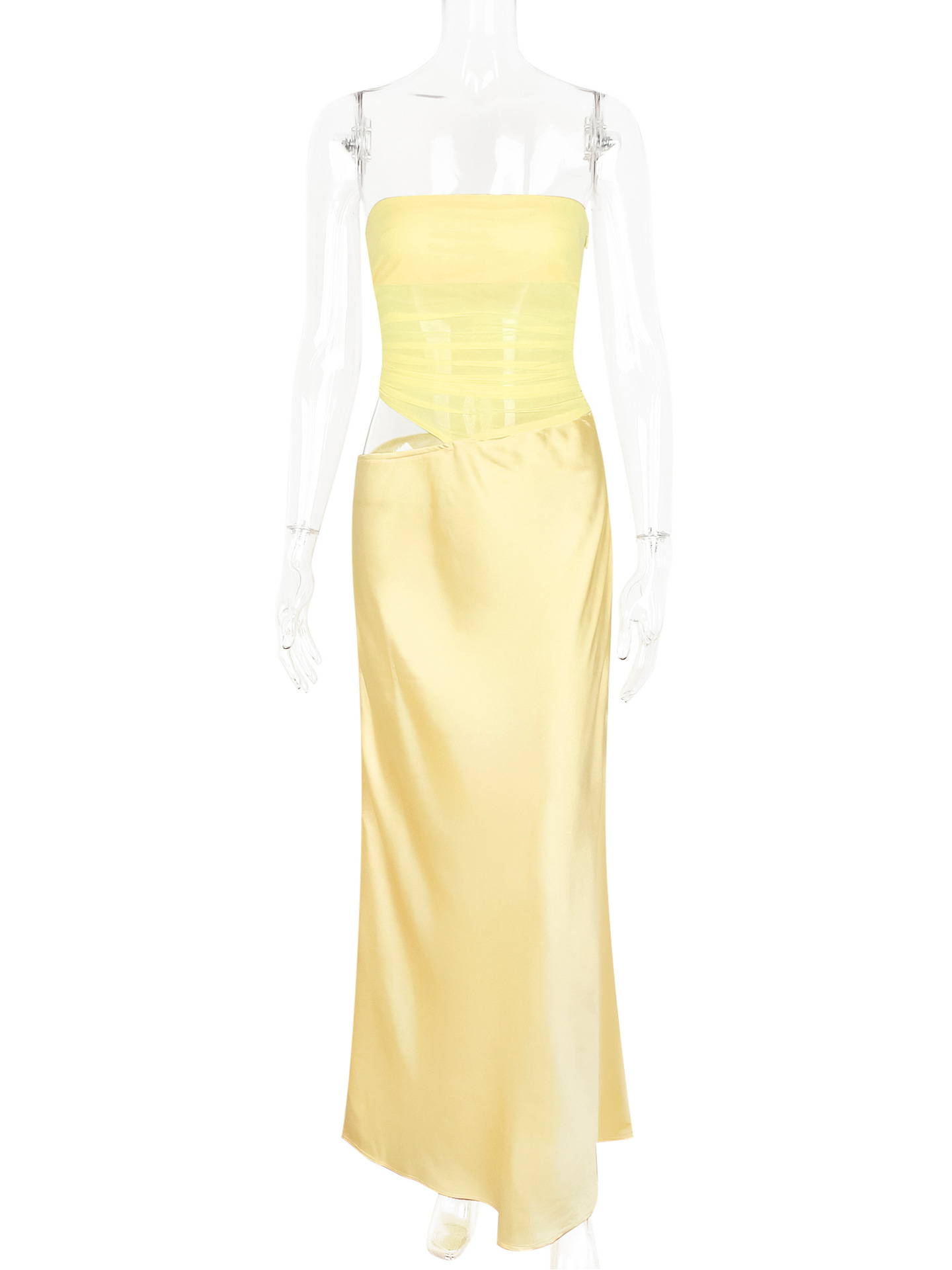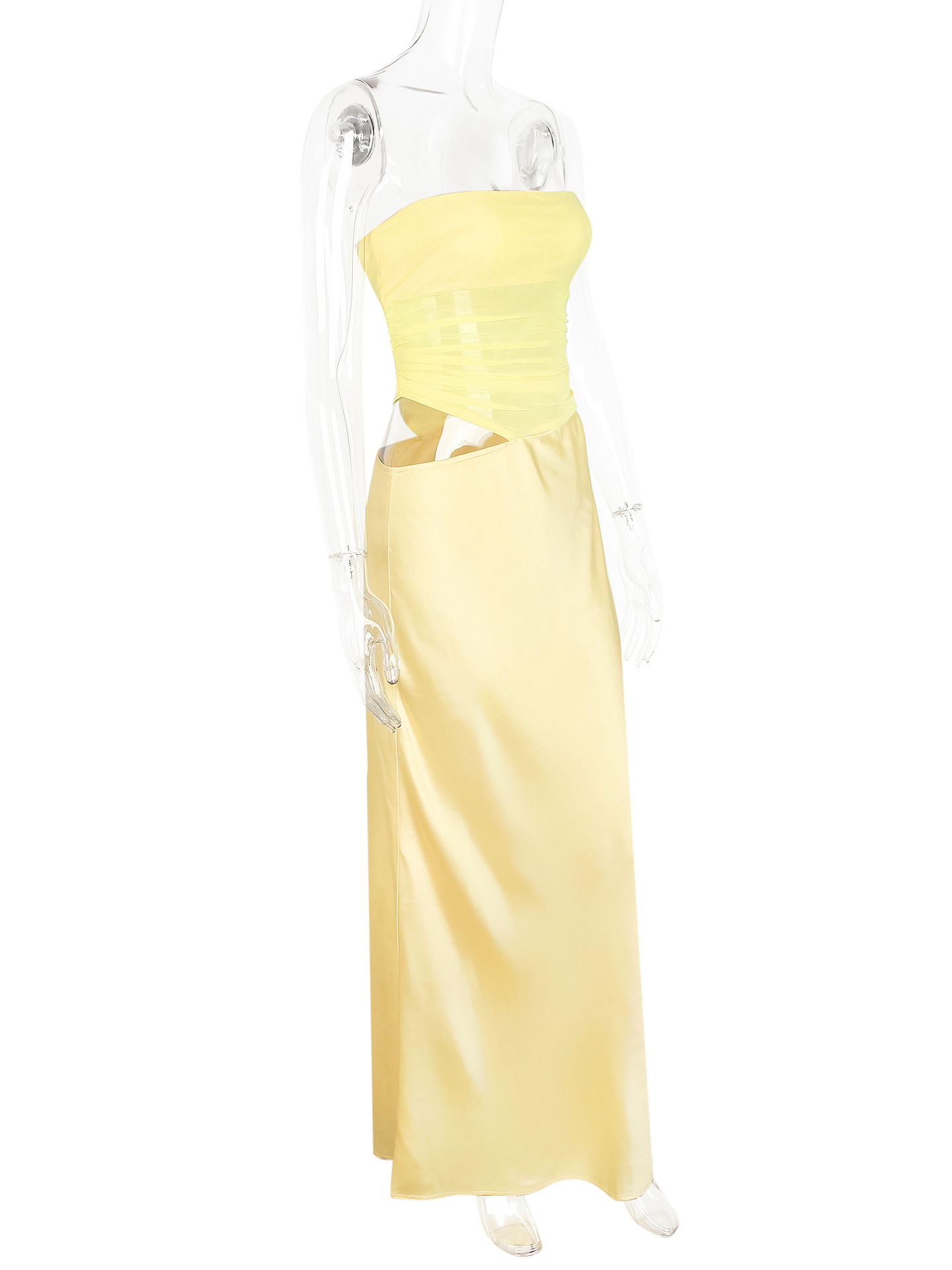 Sexy Tube Top Hollow Out Cutout Backless Yellow Dress French High Grade Satin Dress Sexy Summer Beautiful Dress