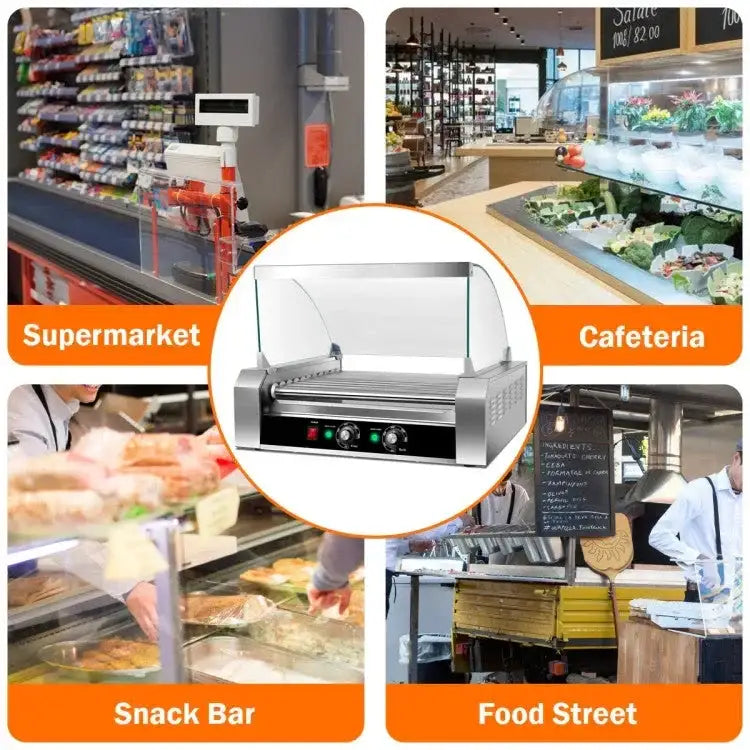 Serve up delicious hot dogs quickly and efficiently with this stainless steel hot dog roller machine, designed for both commercial and home use. With 11 rotating rollers, a toughened glass enclosure, and easy operation, it’s perfect for events, convenience stores, or family gatherings. Built for durability and convenience, this machine ensures evenly cooked sausages every time.