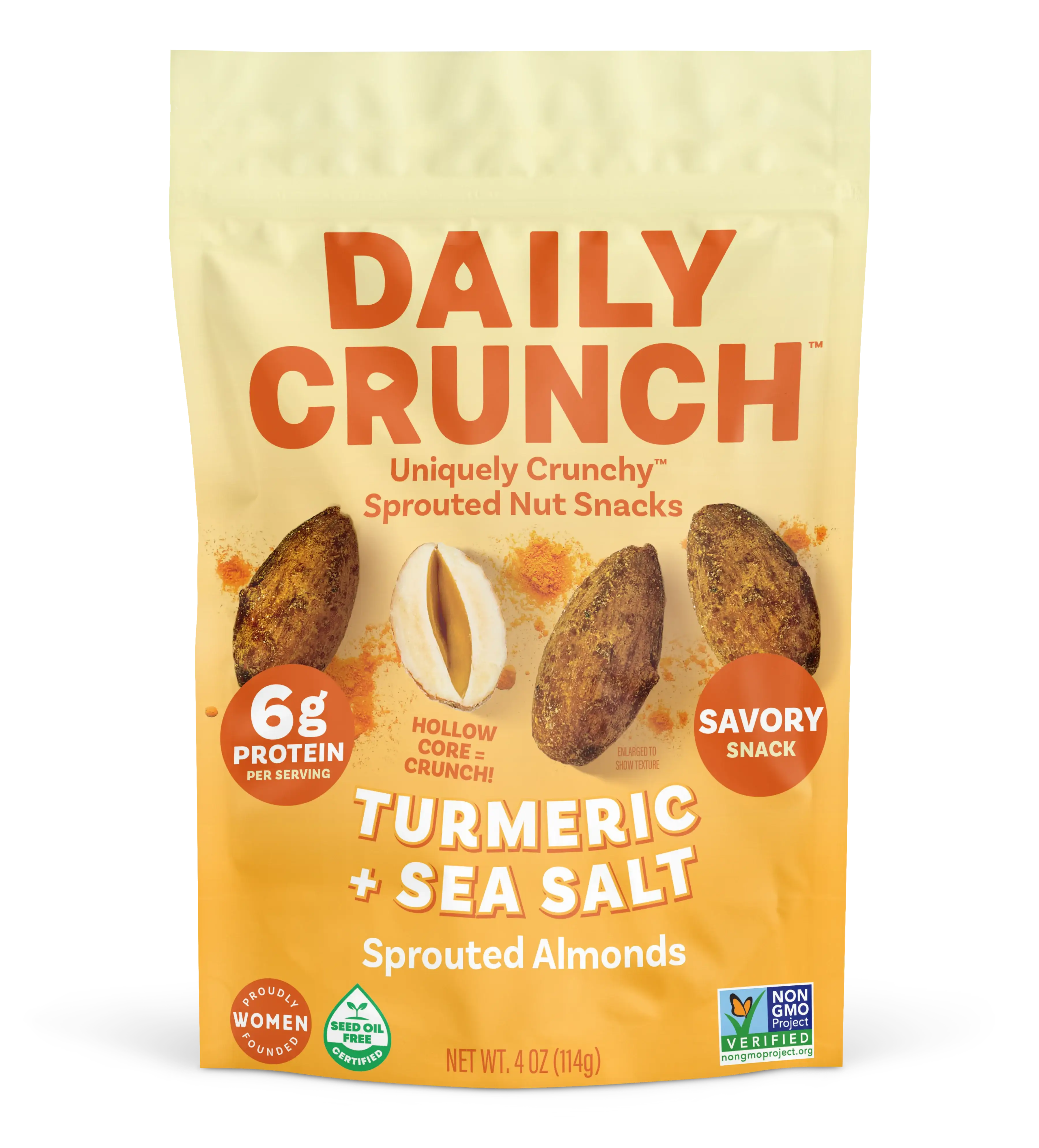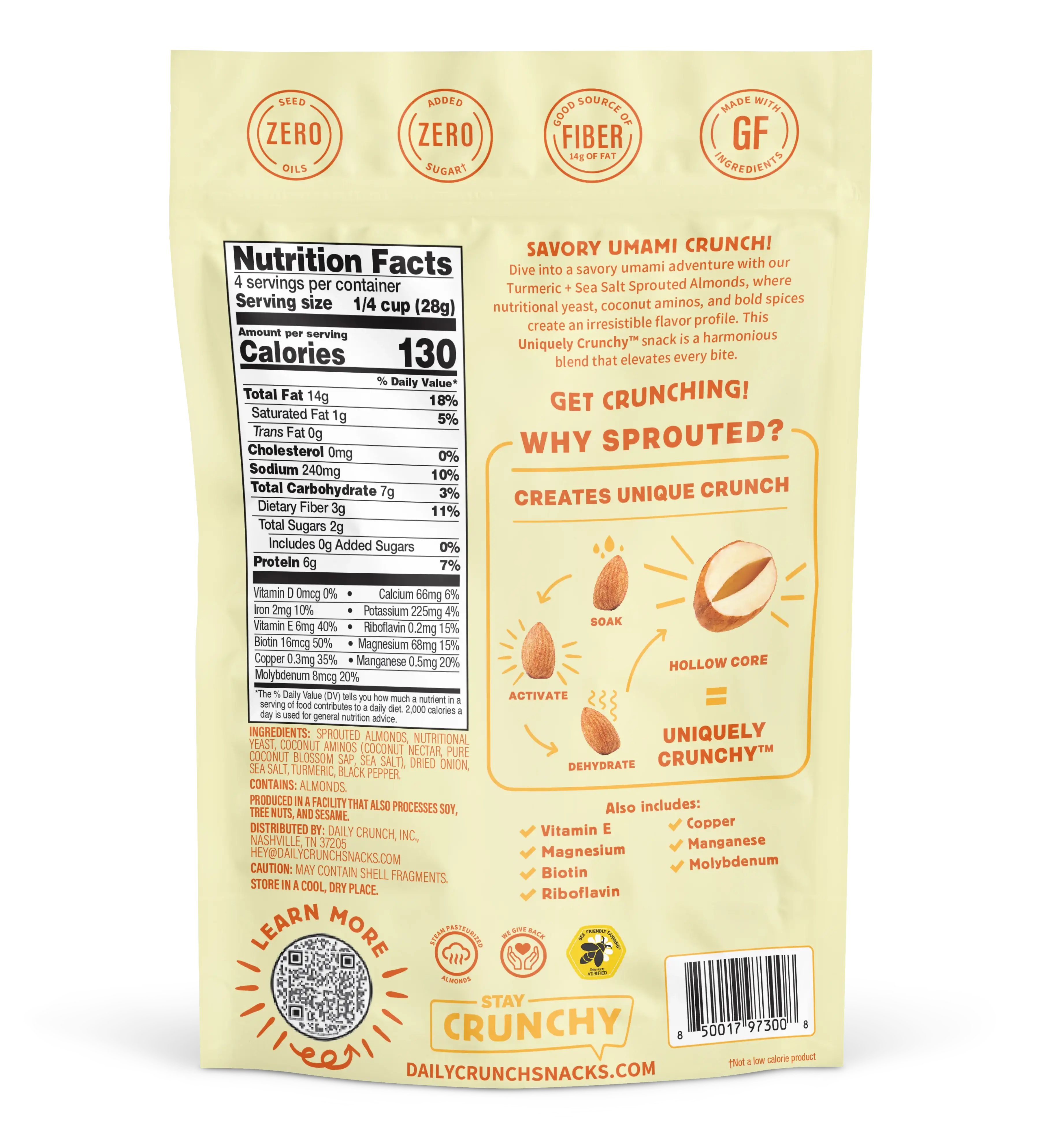 SAVORY UMAMI CRUNCH! Dive into a savory umami adventure with our Turmeric + Sea Salt Sprouted Almonds, where nutritional yeast, coconut aminos, and bold spices create an irresistible flavor profile. This Uniquely Crunchy™ snack is a harmonious blend that elevates every bite.