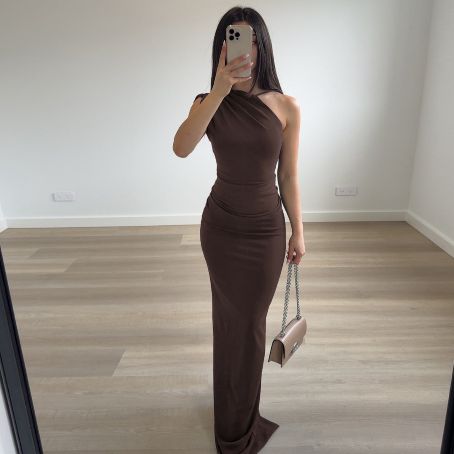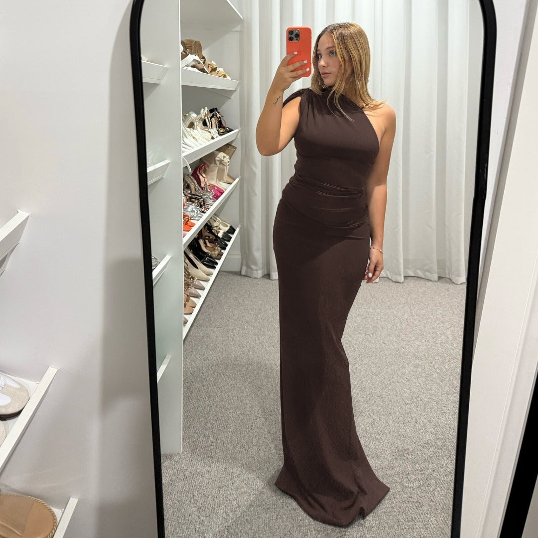 Women Clothing Summer Sexy Slant Shoulder High Waist Slim Fit Slimming Solid Color Sheath Dress
