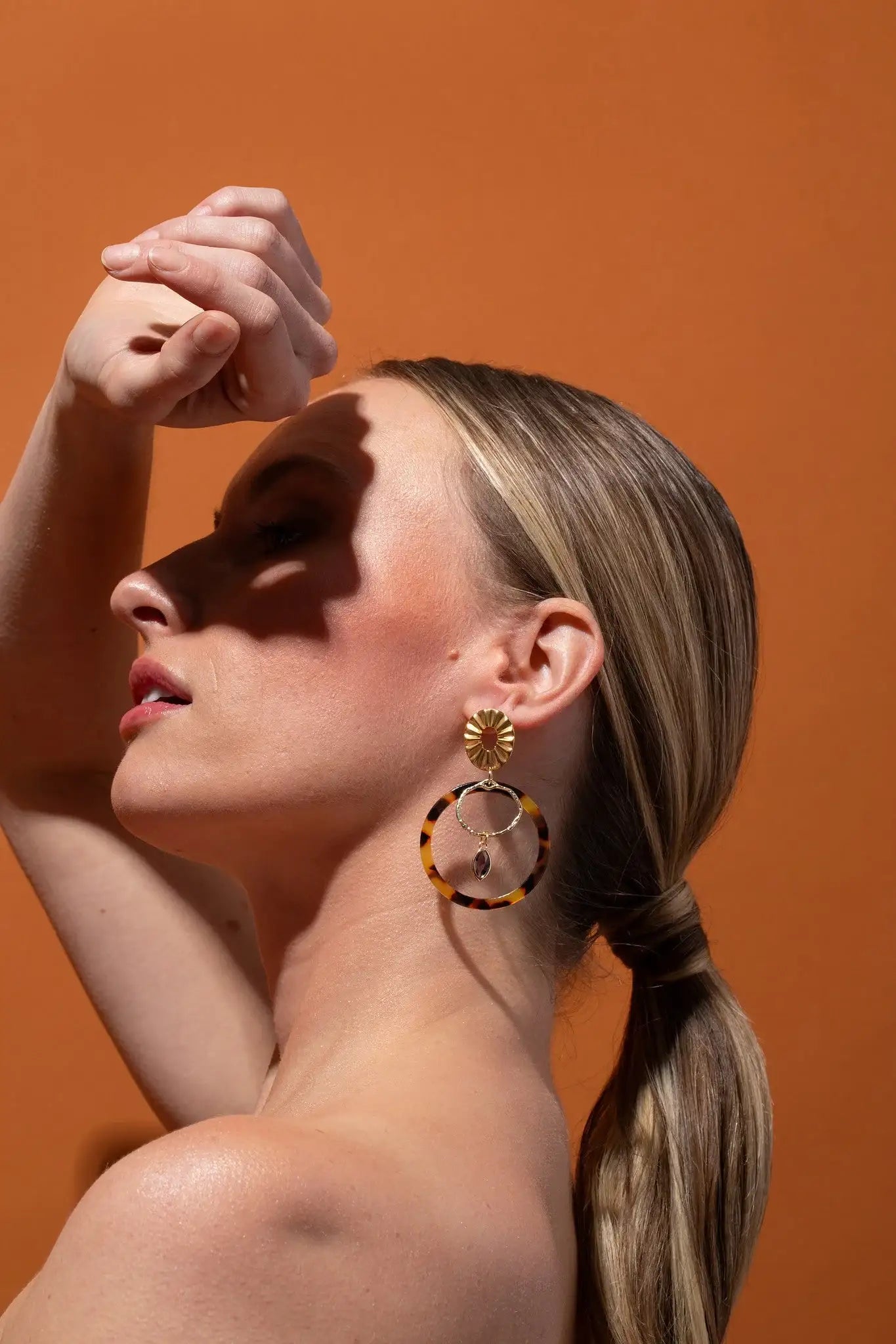 The Zahara Hoops feature a sophisticated vertical story, pairing a high-shine fluted gold post with a classic tortoiseshell resin hoop and a unique internal stainless steel ring. Designed for the woman who demands both high-impact style and technical durability, these hoops offer a bold silhouette that remains effortlessly lightweight.